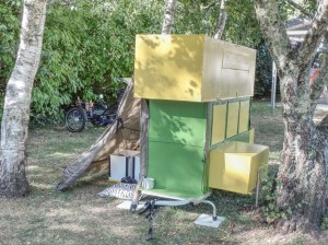 I built the bicycle camper-trailer over winter 2023 using plans obtained from Robert Beriault. It was constructed using a lightweight wooden frame skinned using corflute – a plastic cardboard lookalike. Waterproofing and some fixing was by gaffer tape. The wheels and tow-bar were supplied from a Burley trailer.