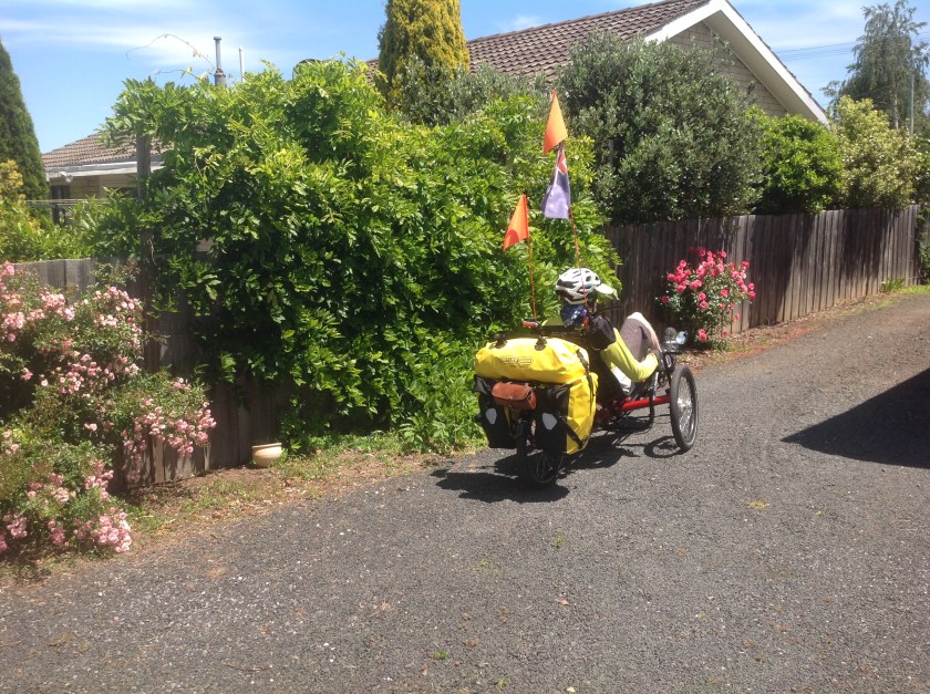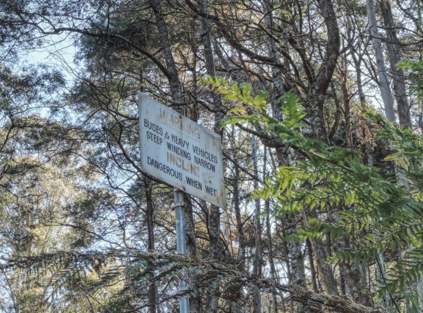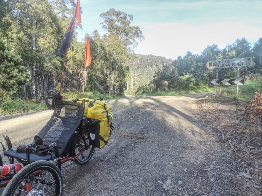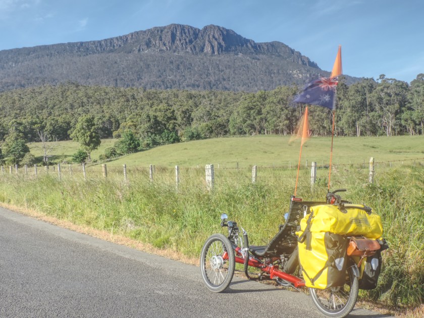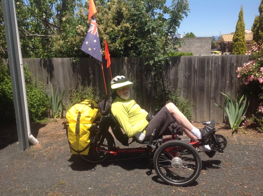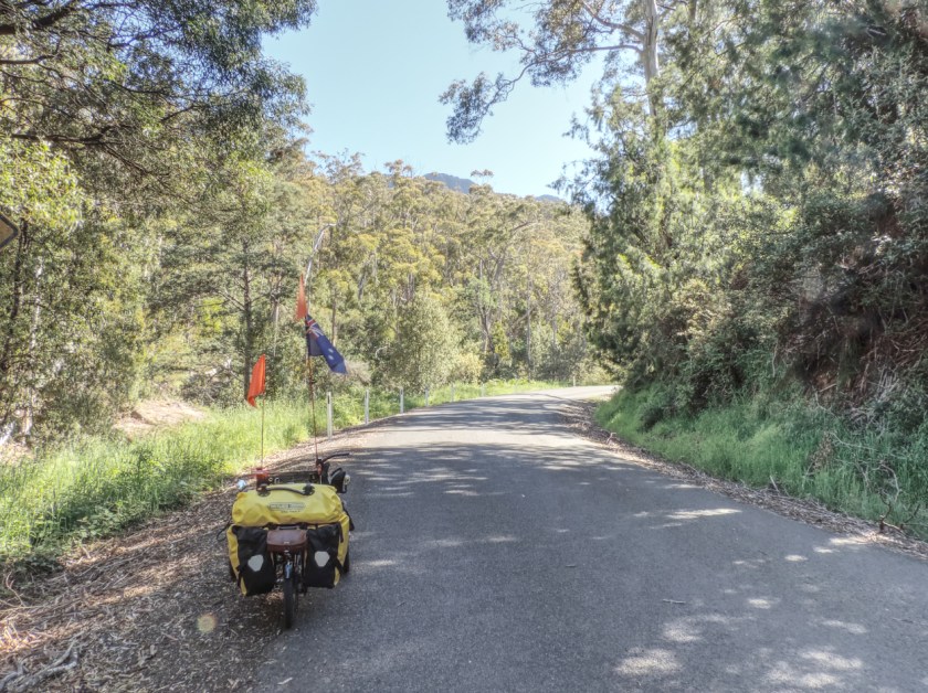 A feature of this ride is that, once the uphill starts, so do optical delusions. The road sometimes looks like it is running downhill – but it isn’t. If you coast – you coast to a halt !! The small ring on the front is needed and is, by now, engaged. It is a concern that I passed 2 squashed Tiger Snakes on the above stretch of road. Very colourful they were – probably means they are up for mating? I had better watch out for sticks and avoid running over them. Sitting on a recumbent trike you would be a bit close to the action if a stick turned out to be a snake sunning itself.