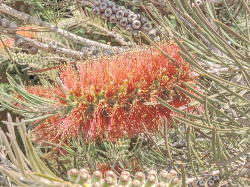 Chita Road towards Longford starts with a lengthy hill to climb. On the left was the usual fence but behind that for quite a way was a line of Bottle Brush bushes – all flowering and most with a bright red flower. Mixed in were a few bushes with the less showy pink or white flowers. I looked for Honeyeaters who usually fly in to pillage the nectar but didn’t see any.