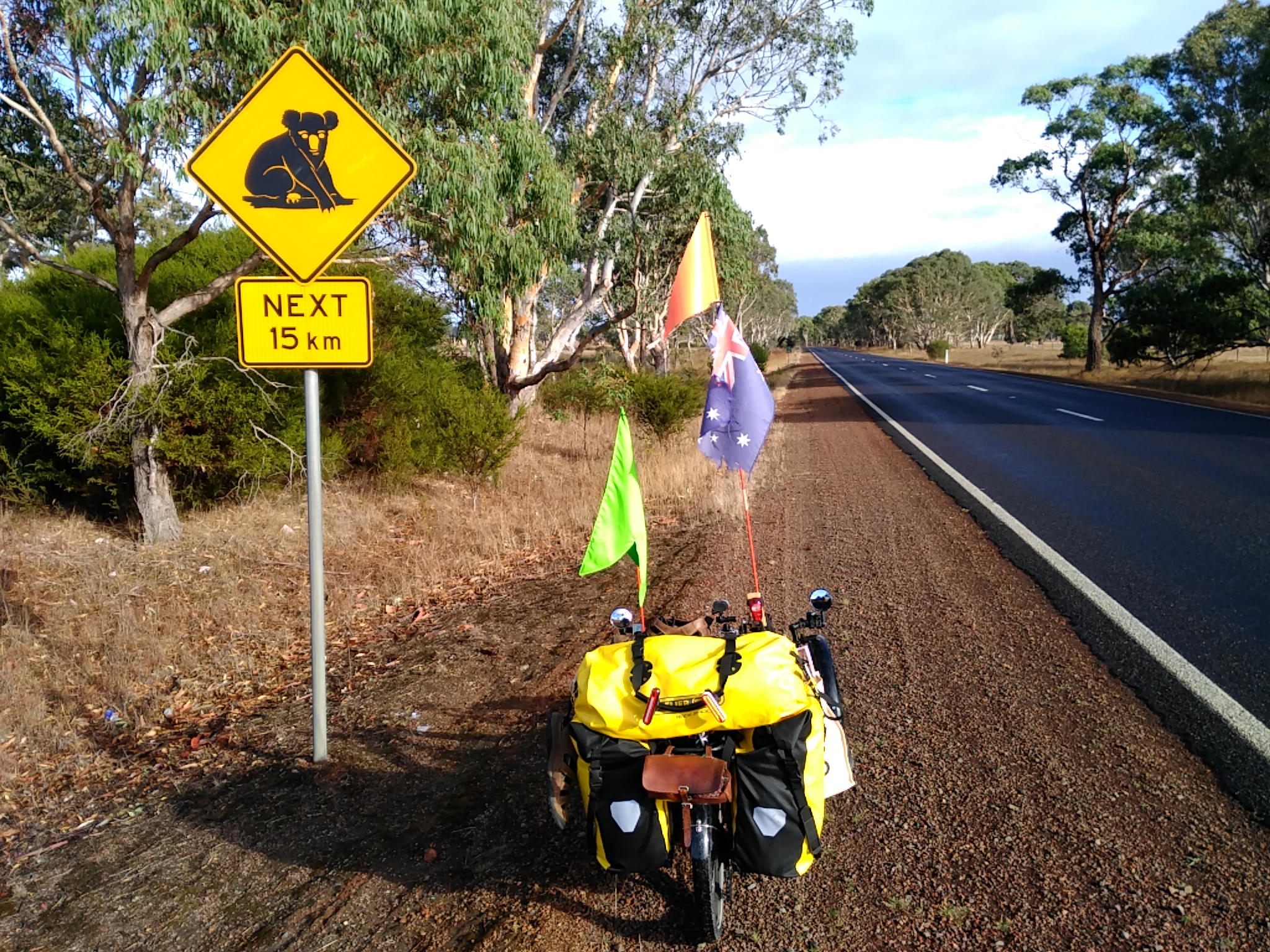 Half way to Coleraine this sign appeared. Now there was something else to look for. The system is, check ahead, something coming then check mirror. Anything behind then hit the dirt. Nothing in either direction then look up. Any Koalas? No, loopback to check ahead and repeat.