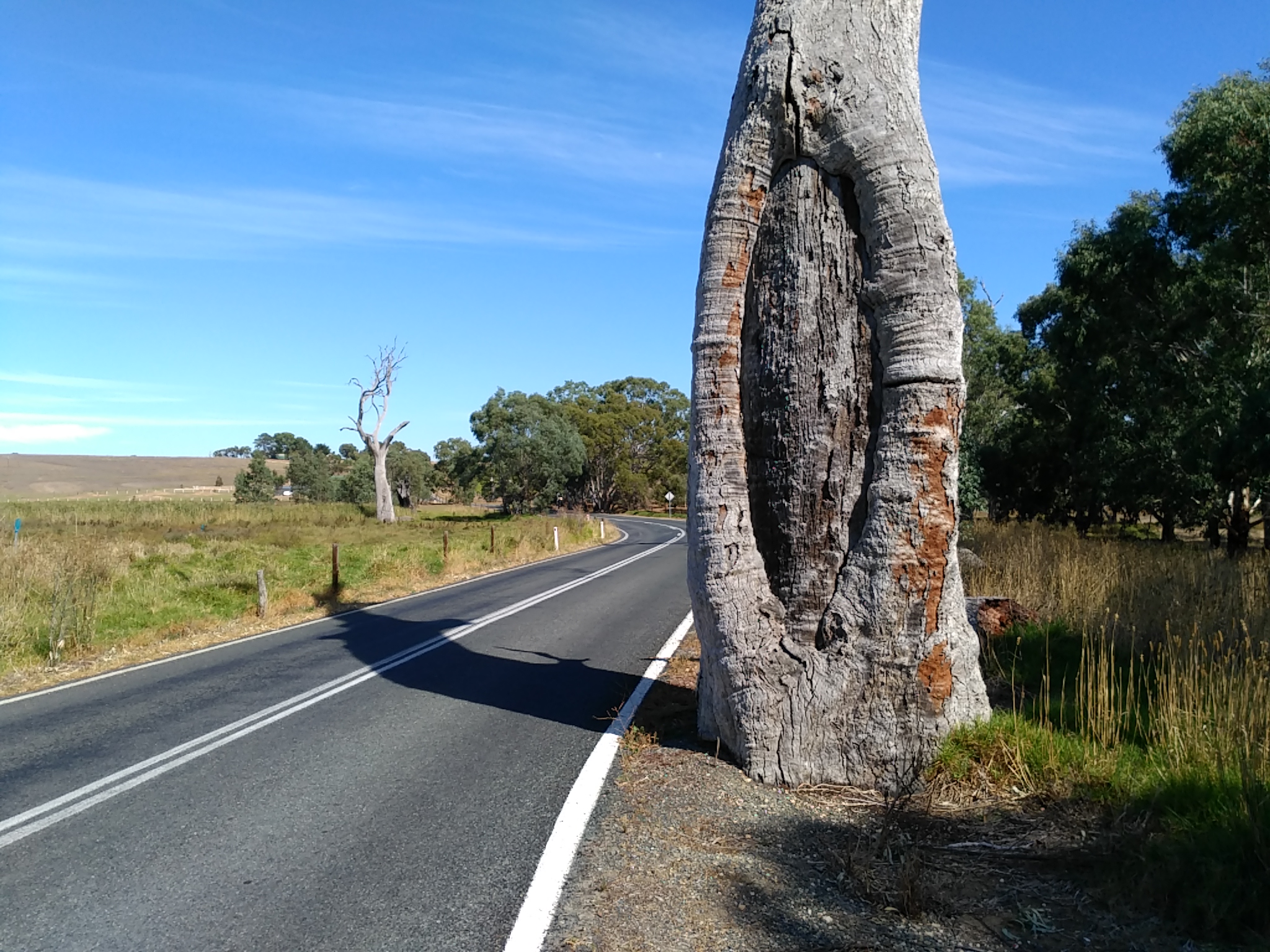 Along the short cut a bit, the road went down to a creek crossing. There the vegetation was green and the old trees showed where Aborigines have removed part of the bark for canoe making. This was some time ago as the scar is well integrated with the tree.