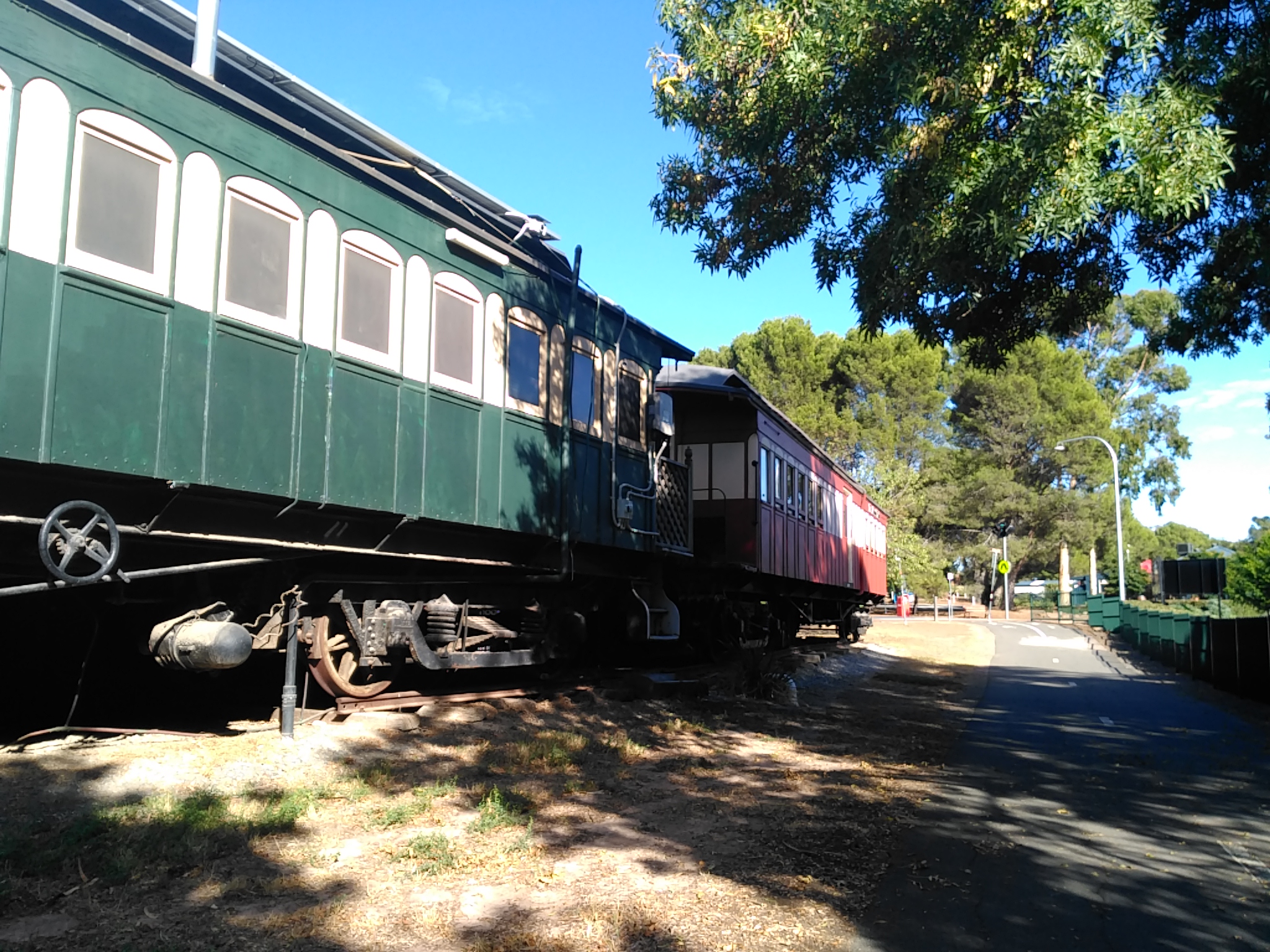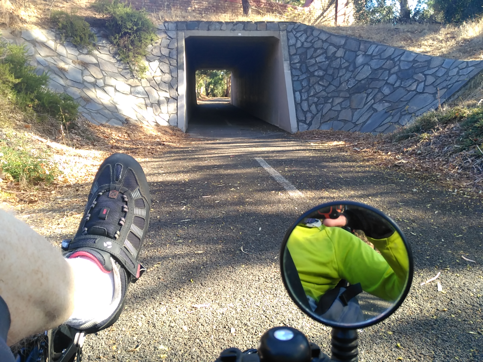 At 3.5ks to the end the downhill began. That was nice but bumpy. Very twisty and quite fast I enjoyed limiting braking and keeping up in the 30s while once again leaning to keep weight over the inside wheel to keep it on the ground. Over pot holes, glass and pine cones we dashed – down to a sudden stop at a major road junction. South Road and Flagstaff Gully Road but no sign of anything like a cycle lane or where to go to find one. So I called Sue who was exploring the Adelaide Markets and she drove over to pick me up. I had to ask someone what suburb I was in. “Sturt” he said. I gave Sue the name of a road crossing South Road (a very busy multi-lane road), told her the suburb was Sturt and cycled up to the road on the footpath. Around the corner a sign told me I was now in Darlington and Marion. No matter, Sue found me.