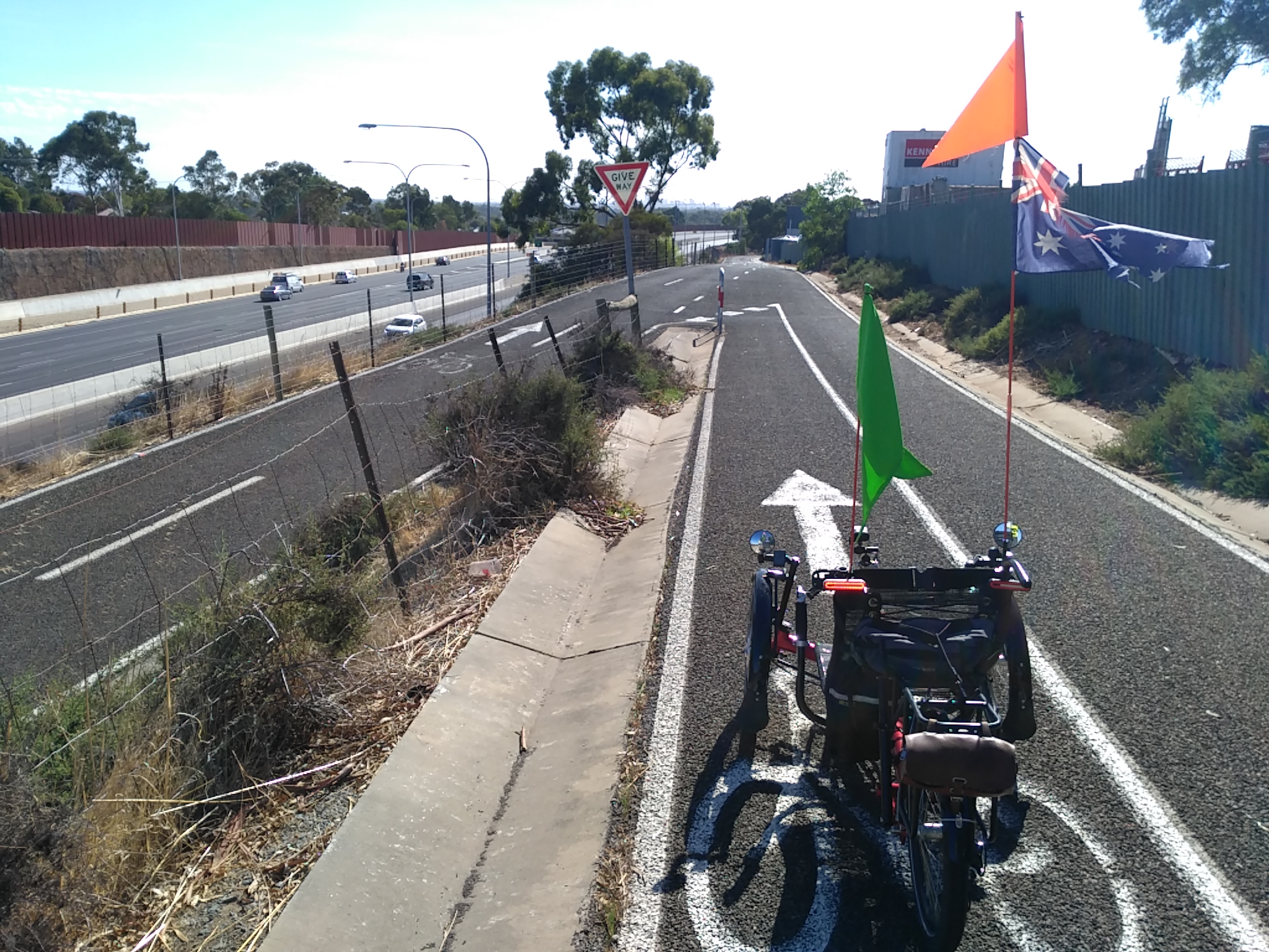 Quite a few cyclists on the path this morning. Mostly less energetic older persons like myself. Add kids, walkers, dogs, lovers and family groups it was an interesting ride. There were regular crossings of main roads. Most were handled by a quick dive to the central “refuge”, wait for a gap and head for the far side. The “refuges” don’t seem quite long enough to fit the trike in and it did feel a bit exposed out there in the middle as vehicles flashed past. Some crossings were light controlled. They were better.