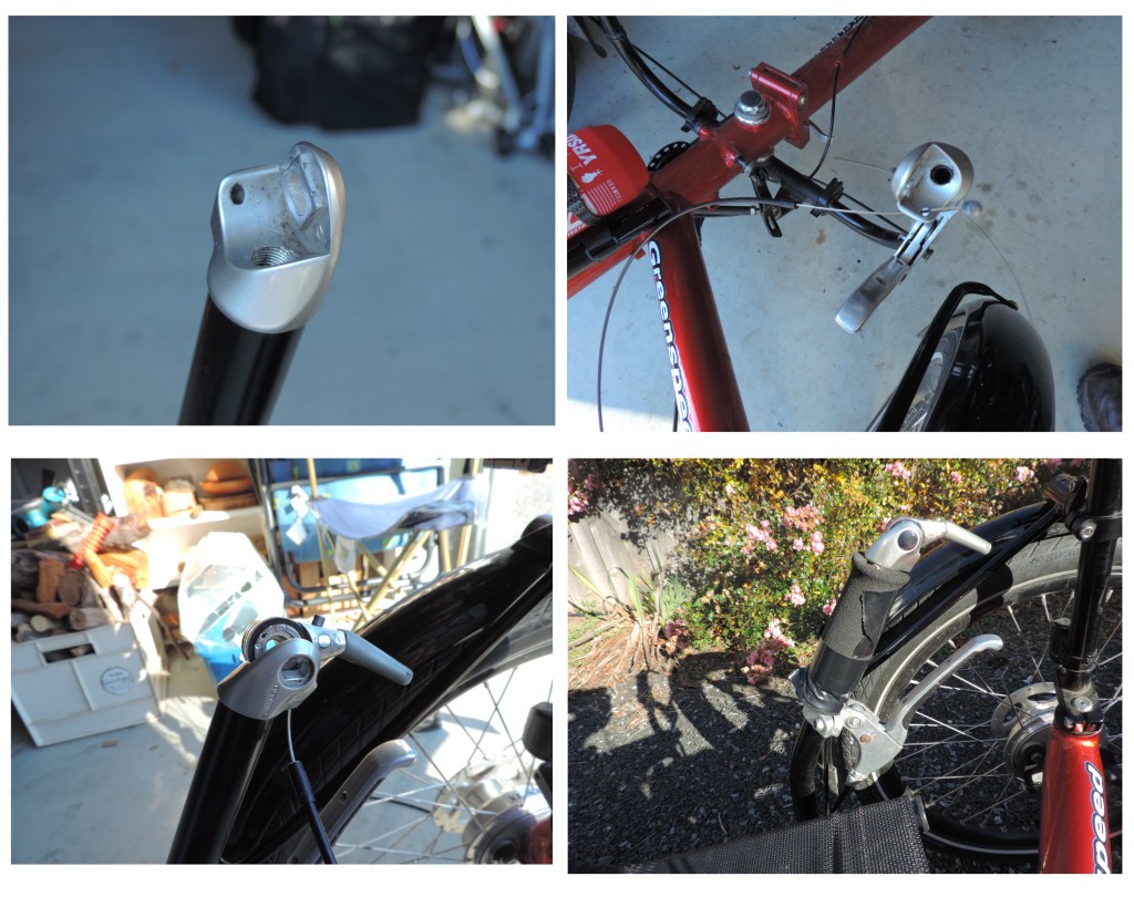 After getting the above sorted, it was then necessary to route the cable set correctly through the lugs on the frame, curve it up to the front derailleur and add several cable ties to lock everything in place. That took another cup of tea! Finally it was all back in place and the ratty old handgrip reinstalled using some gaffer tape (bottom right). Next job – new handgrips!