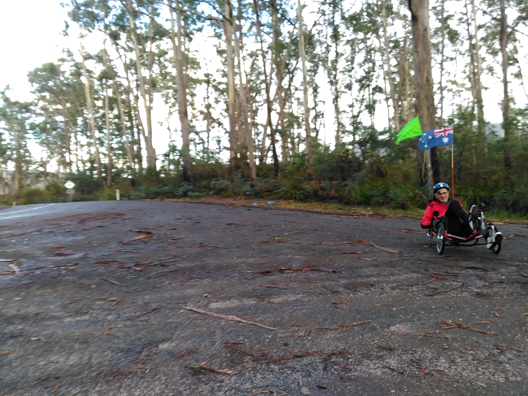 Friday and the River Road at Deloraine. Colin had borrowed an X1 Greenspeed to ride – he was thinking about buying it and was offered it for a week on appro. I have mentioned this trike before when Rob brought it along to a ride. It looks like a smaller, lower, meaner Magnum on it’s 16″ wheels.