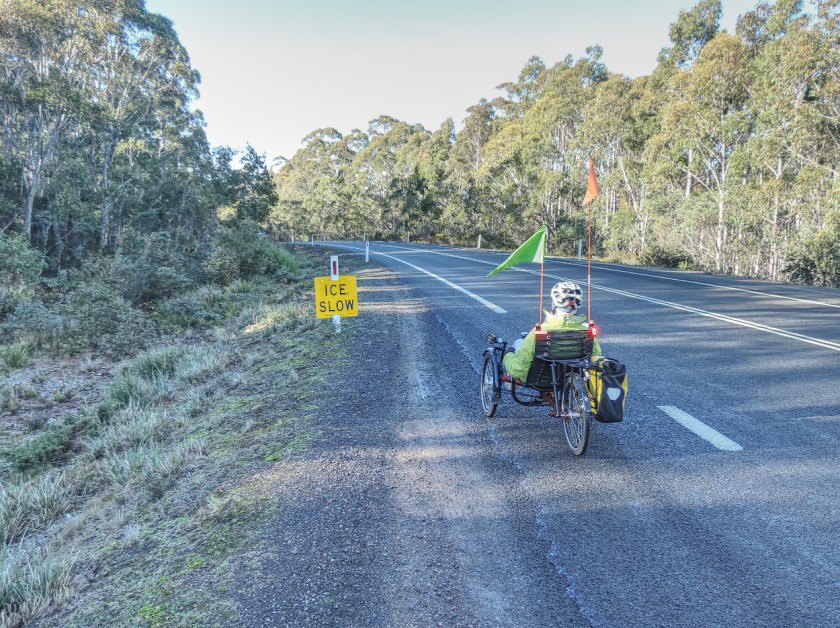 Sue and I are spending the next week visiting friends in the south of the state. We did a similar road trip in early 2018 and I did this downhill cycle on the Brompton – and encountered difficulties cycling one-handed at speed.