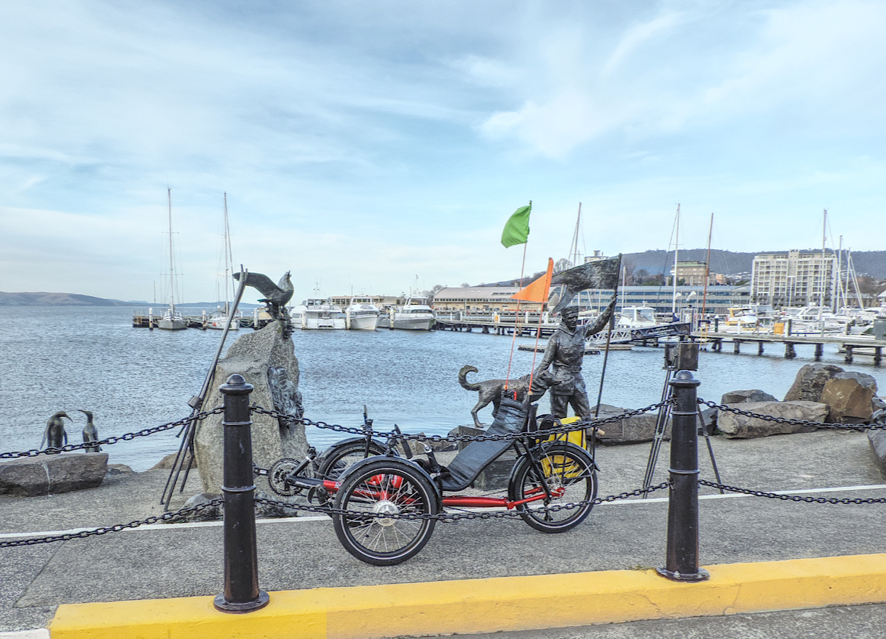 I began the ride at Salamanca Place in the heart of the Hobart warehouse area. Here, old warehouses have been converted into Cafes and Restaurants which entice the rest of Australia and a lot of Asia to come down and see us. Today it was just really, really, bloody cold. It reminded Sue and I of the days we would set up Sue’s Saturday Salamanca Market stall in the middle of winter and the lazy, icy wind would blow through all your clothing, freezing you to the bone. Today Sue watched me get the trike out, muttered something about “nutter” and drove off to somewhere warming.