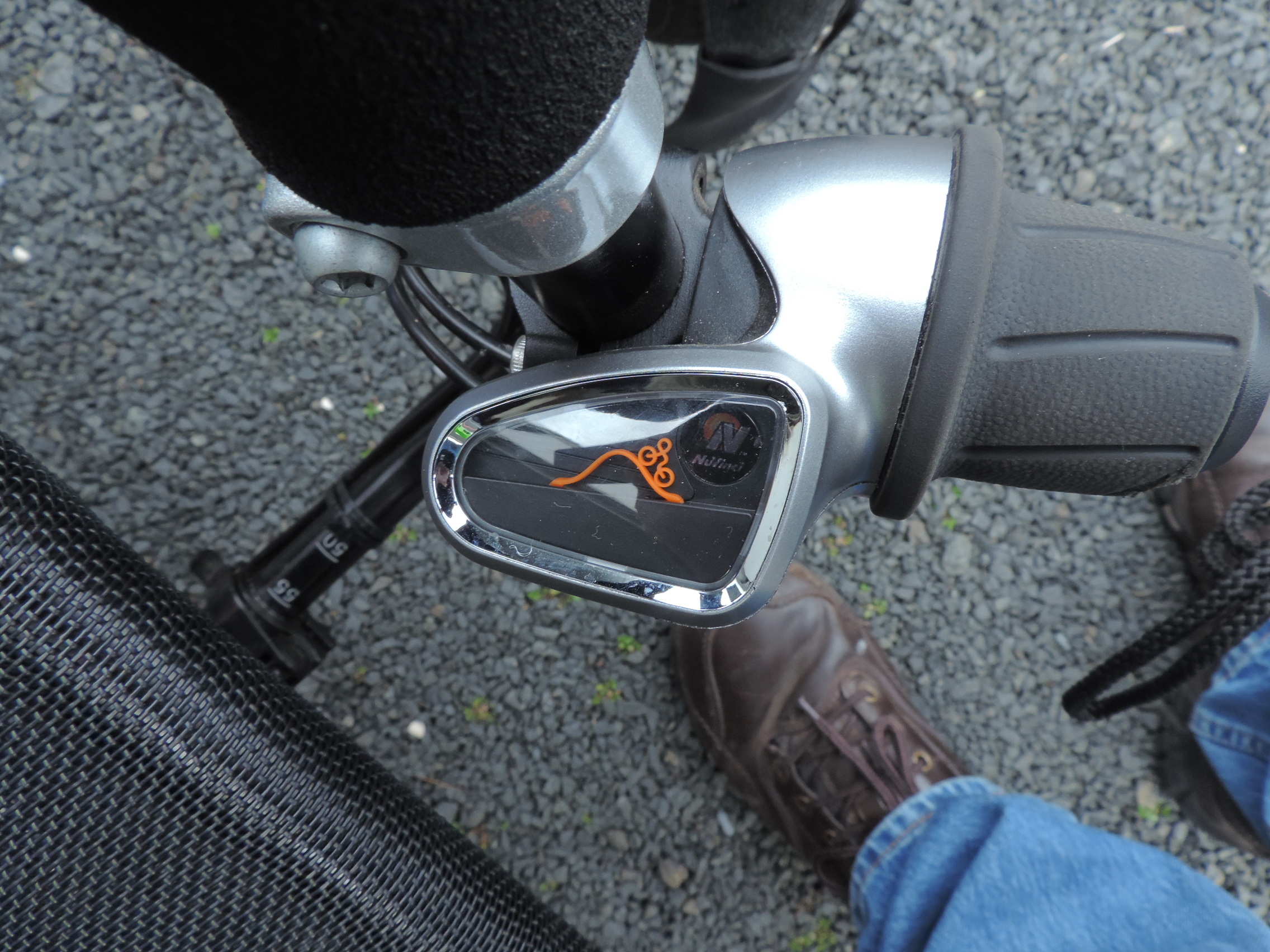 The rear gears are in the nuVinci 380 hub (not a 360 as I reported last week). The controller of the CVT gearbox has a graphic of a little cyclist either climbing a hill or going along the flat towards a downhill section. Not that you look at it much.