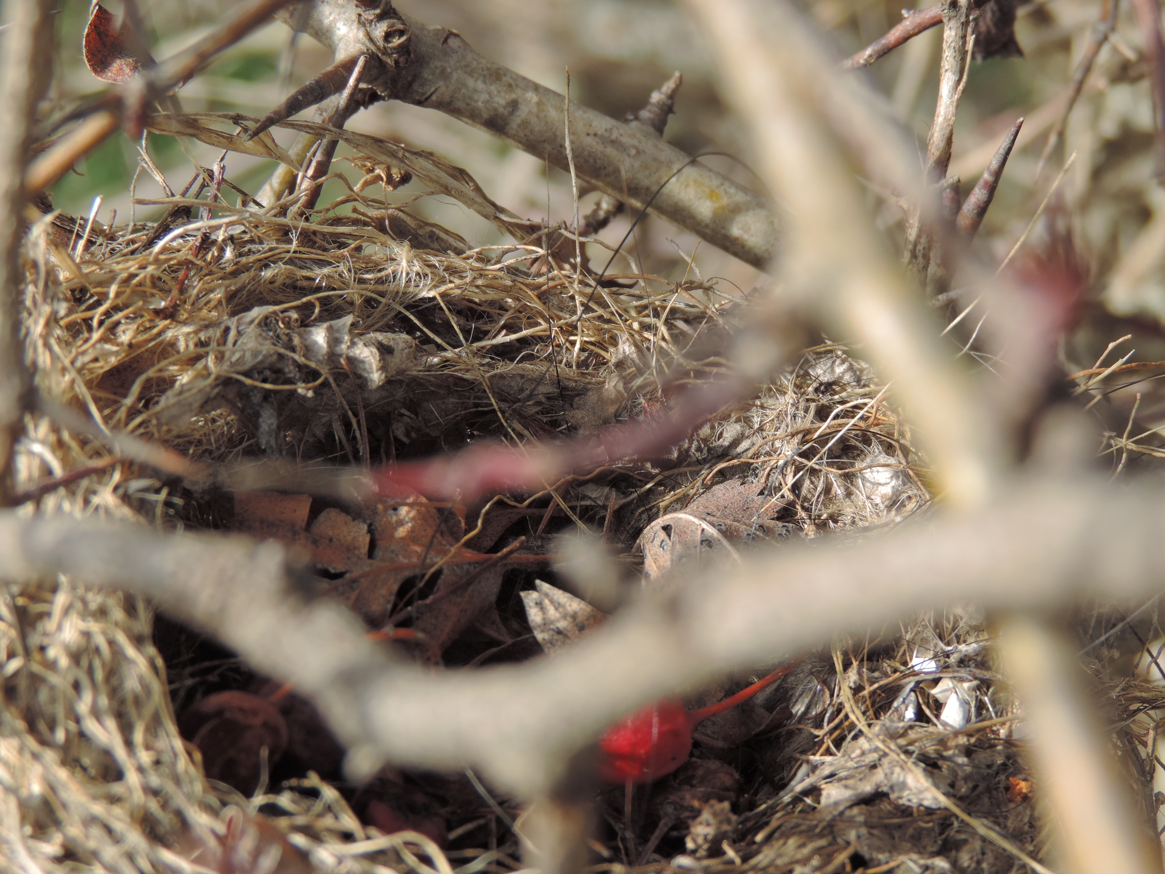 A small nest tucked away in a bare hawthorn hedge.