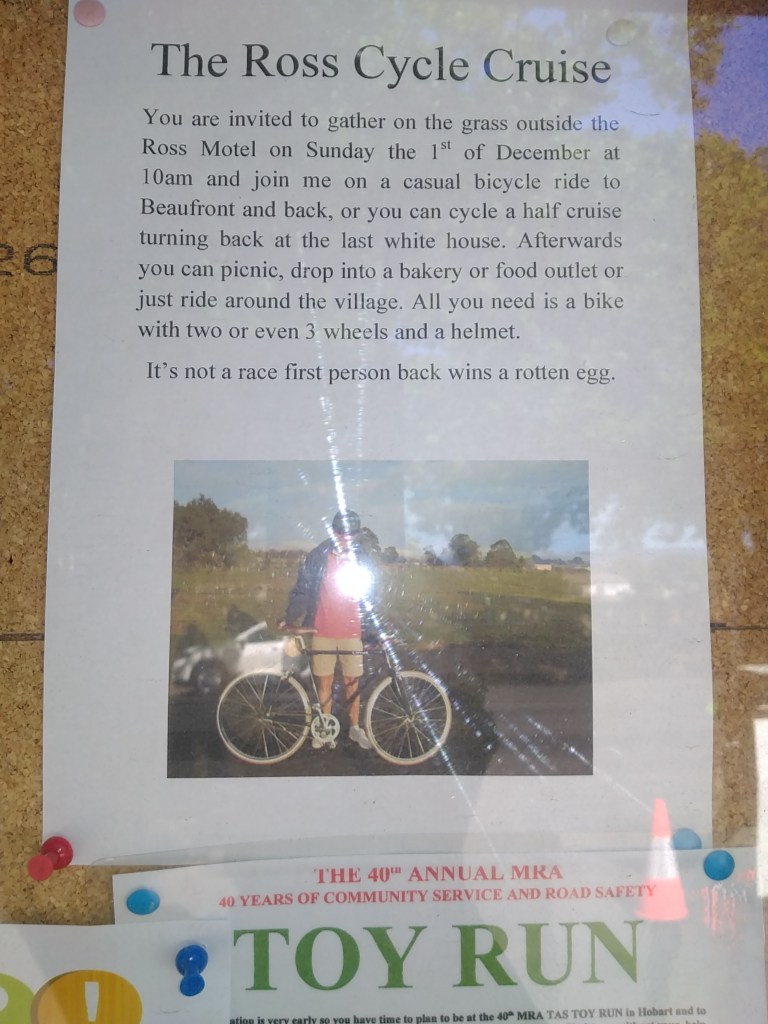 We returned to the river bank for farewells. They went home after agreeing to a repeat ride in March 2020. I carried on with a short tour of the Ross backroad (singular) but the wind was really annoying and pretty cold considering it’s the first day of summer. I passed the Cafe but decided against a coffee, sitting outside getting cold just to keep an eye on the trike. Packed up and returned home wondering, just a little, was it worth the drive?