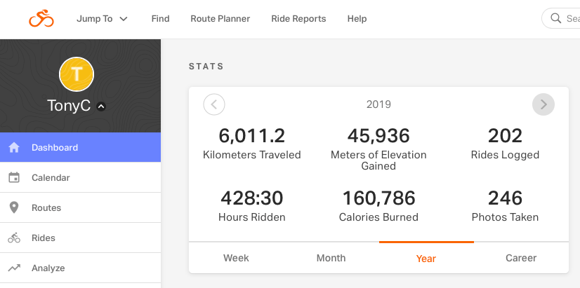 What’s this? A glitch in “Ride with GPS” has the main counter for 2019 showing I have succeeded and a Goal saying there is 19k to go. I choose this one!