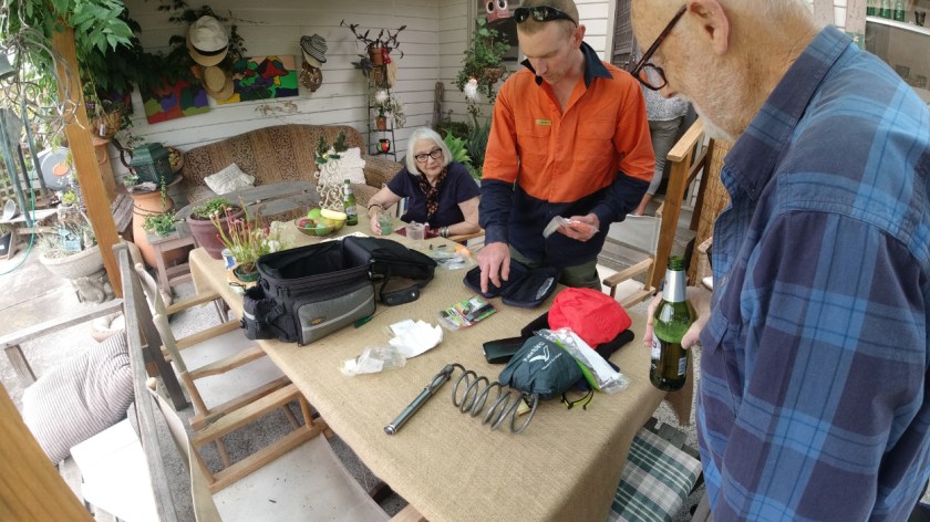 That evening Ken had a visitor – Anthony. Another cyclist. Anthony is a bike-packer off-road tourist and has just completed building a state-of-the-art bike for southern Tasmania trail riding. He is a minimalist and has always wanted to clear out Ken’s cycling bag as Anthony believed there was far too much stuff in it for the day rides Ken does.