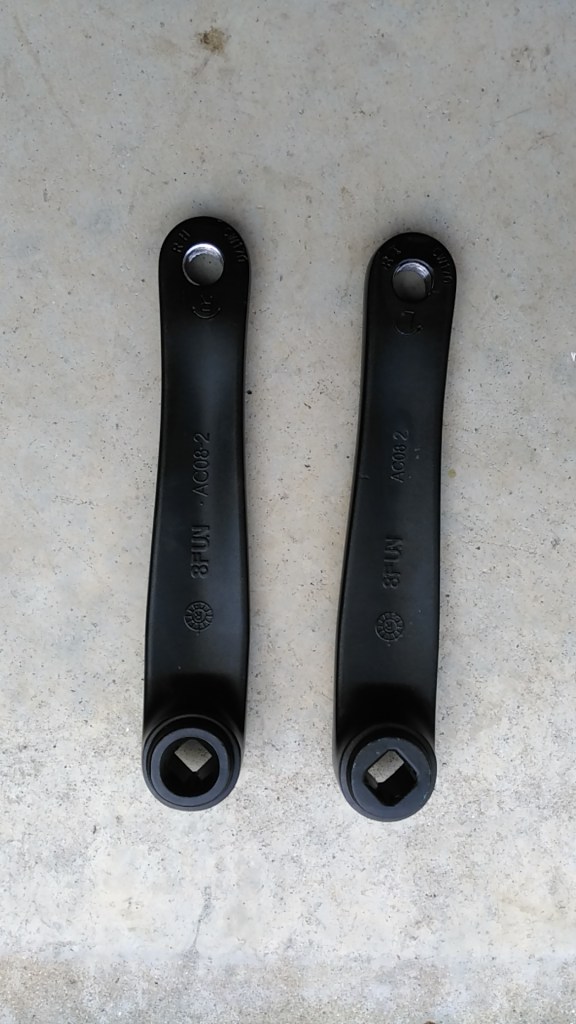 As you can see from the crank on the right, the new cranks, have a degree of offset whereas the originals were straight. I may not need the pedal extenders now.