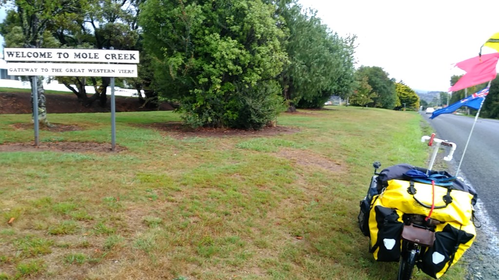 Refreshed, we cycled on through Mole Creek itself on loose chip seal that, hopefully, is still being worked on. Then the last 3 kilometers to the caravan park began. It was time for the skies to really open up. When we hit the park it was just quieting down after pouring stair rods the whole distance. The early weather prediction was that the rain would stop at 6pm and now this had changed to 5pm. Would this be the last gasp?