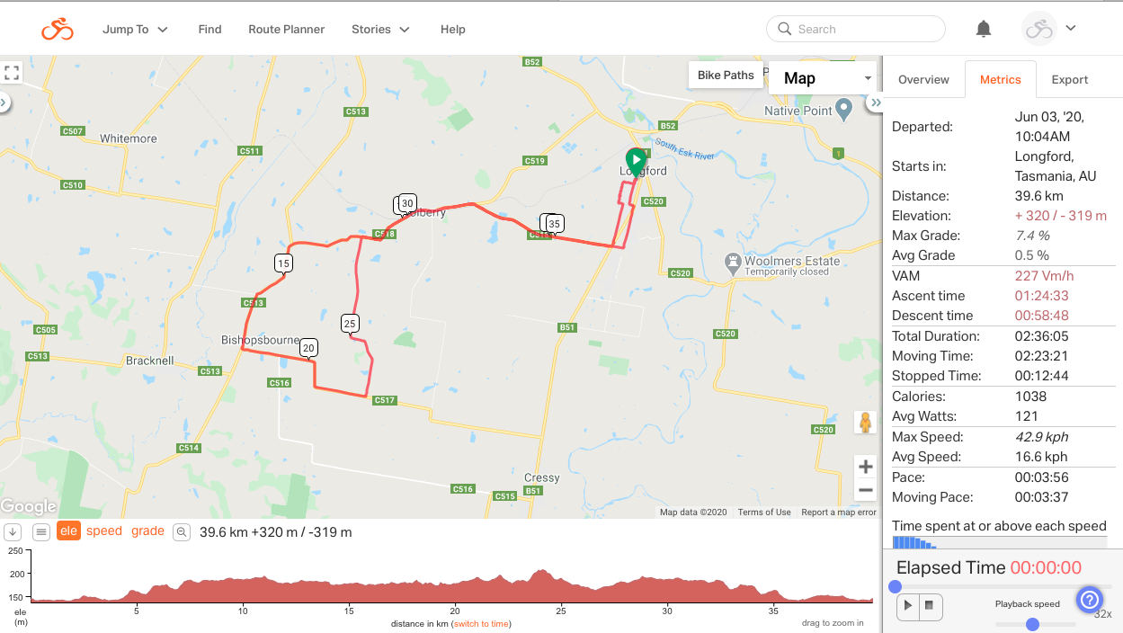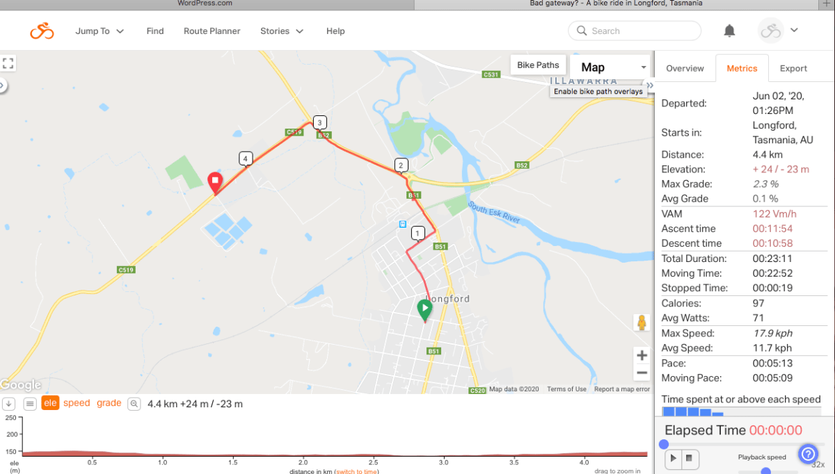 Last week I did get into the 90s but not all were recorded in ‘Ride with GPS‘. The App stopped during one ride with a “Bad Gate” message. I cycle past a lot of farm gates and one of them obviously annoyed it. More often it doesn’t locate enough satellites to allow the GPS to work. I don’t know if the problem is in my phone, the App or in heavenly coverage. Perhaps Tassie, being way down south, is not served as well with satellite coverage as, say, Europe or North America. I have long since stopped recording kilometres covered using pencil and paper and so some distances I have cycled are being lost to history.