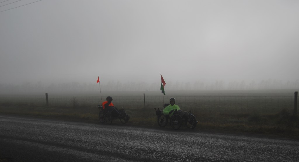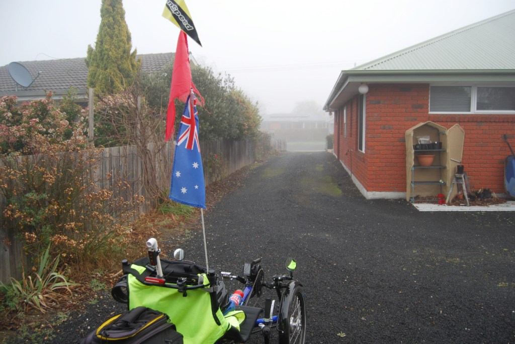 After riding past Brickenden and Woolmers out to the Midland Highway, the fog was lifting slightly and the sun appeared through the haze. Frozen fingers were now only frozen to the first knuckle. We had all our lights on to advertise our presence on the hard shoulder and the 3 kilometers up to the junction off to Evandale passed without incident. Crossing the road to perform the right hand turn involved the sense of hearing in addition to sight thus ensuring maximum safety!