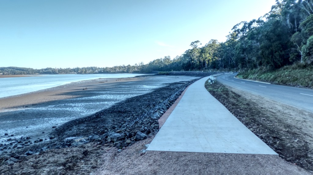 This is the site of the shared path – it will run along the Mersey River down to Ambleside, a suburb of Devonport. As you can see, one side of the road runs up against a crumbly cliff face while the other has the river lapping up against it. The river is tidal here so how can this be done without building something that gets washed away?