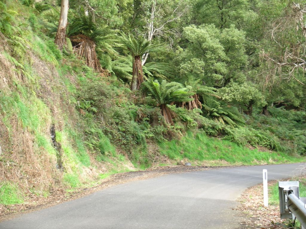 The views were good until the forest closed in. Up and up the road went through some lovely stands of trees which looked like they might be Blue Gums. Then we began to find man ferns dotted amongst the trees.