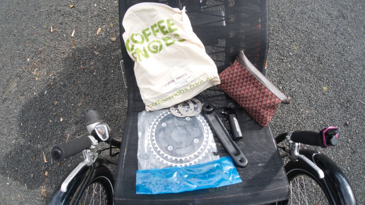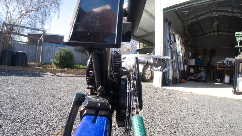 Phil (the amazing E-Bike fettler) of Carlton designed a fitting that supports 2 chainrings. I felt that this fitting may assist with getting the ideal ratios. So Phil made me a 45 tooth / 38 tooth double chainring. 45 tooth – that’s an odd number in more ways than one. Apparently it comes from the Mountain Bike scene and is one tough chainring.