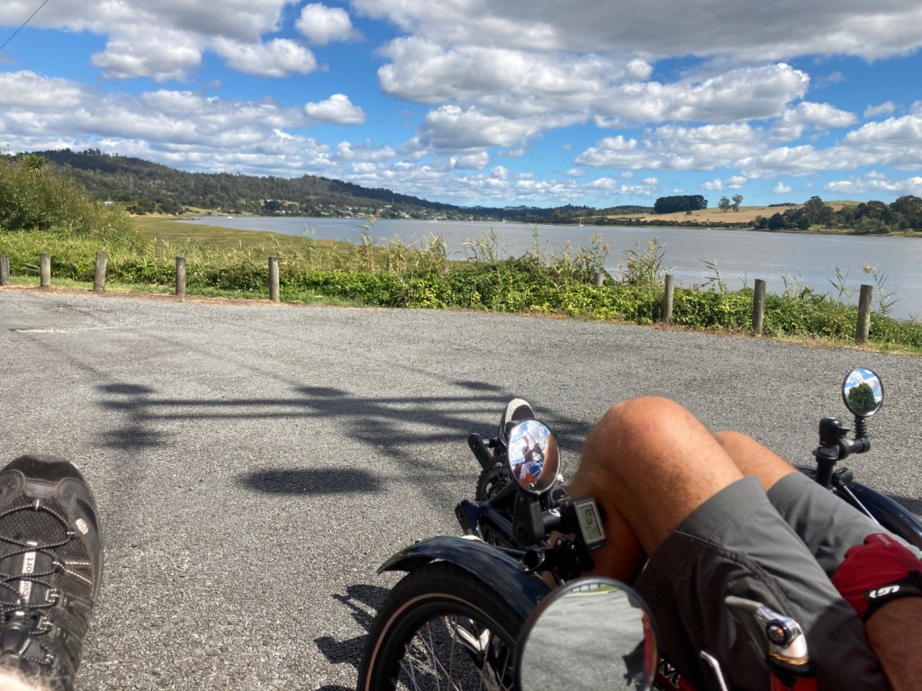 The views were great and traffic light (and careful) but there are a lot of ups and downs involved. Riding a road routed above the flood level, it seems necessary to descend to sea level for every little creek. And then climb back up. Not long descents or climbs but lots of them.