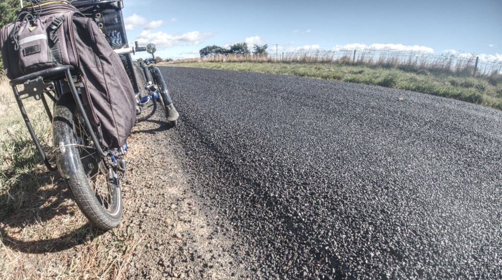 Here, Brompton and I came across some more new chipseal down Panshanger way. Once again, it’s OK.