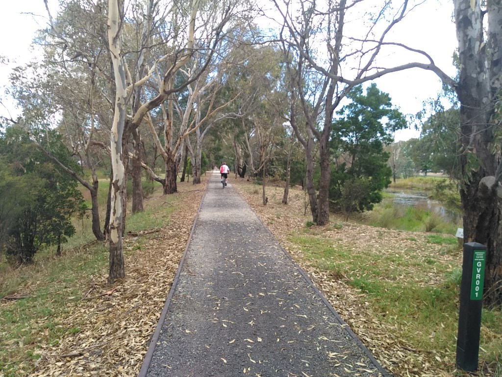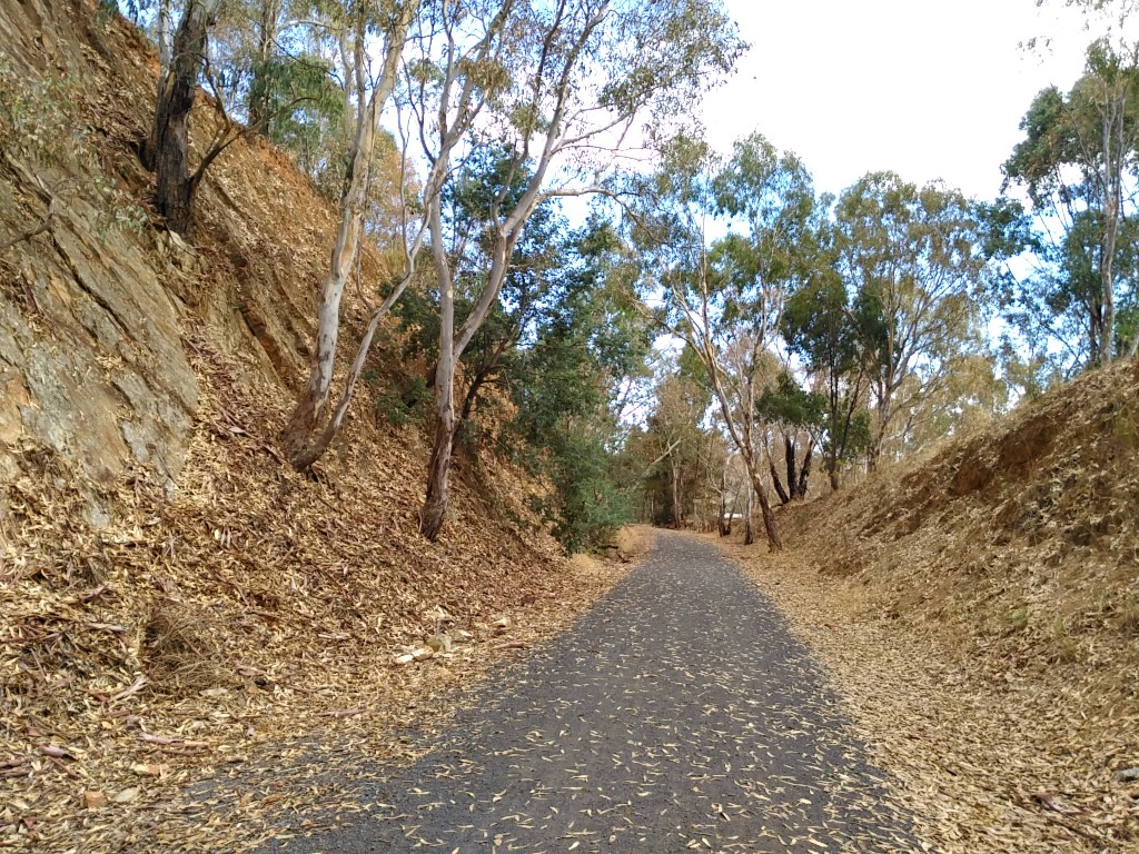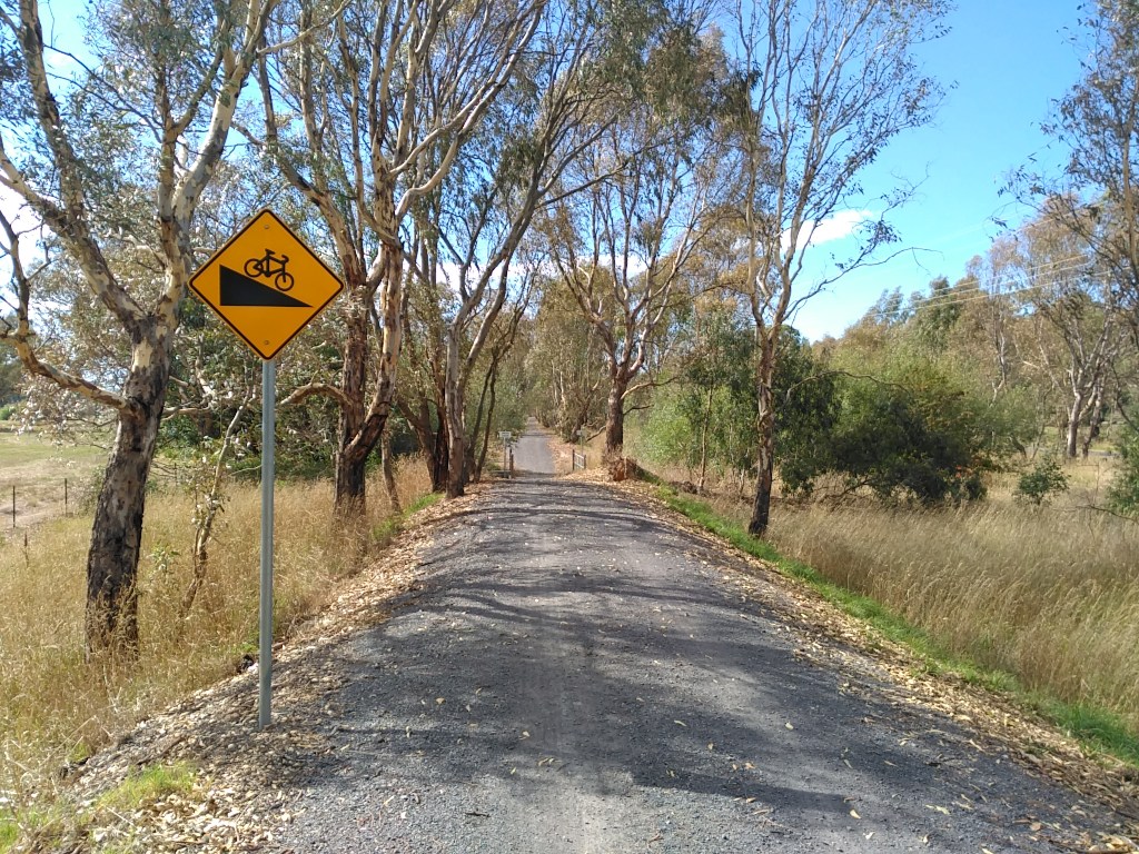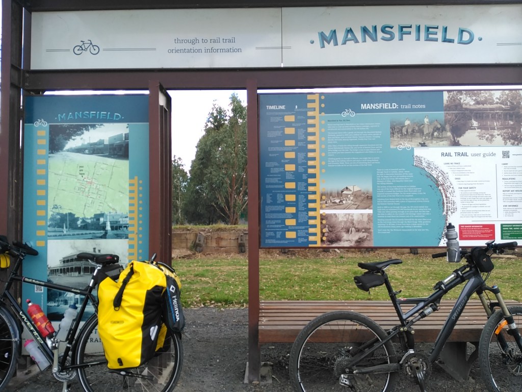 The track surface today was crushed blue metal packed down very well. As ever, a rider has to watch for tree branches and bark across the riding surface. Today several cyclists travelled past heading in the opposite direction. After a while they passed me again – this time overtaking as they returned to Mansfield, after turning around at Bonnie Doon. Up to this point on the trail I only saw one or two a day. Maybe it’s the strenuous riding required but it seems hard for any of them go respond to a “Hello”. Am I breaking some kind of tradition by talking. Is there a secret finger wave I am missing?