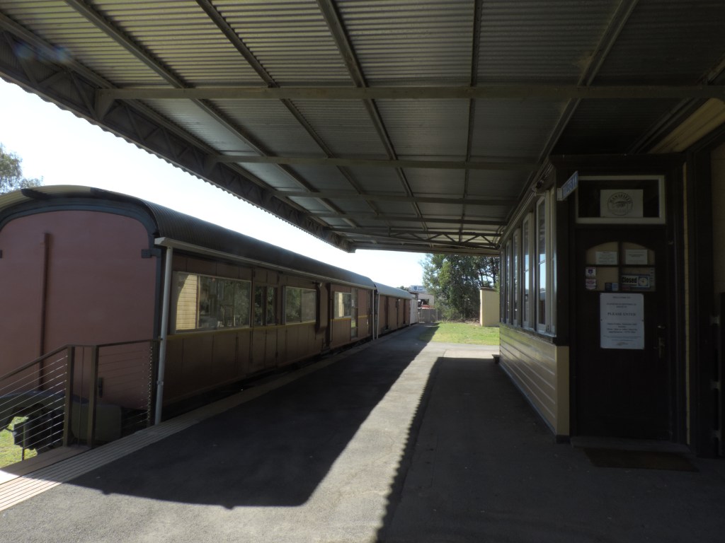 But the kilometer posts keep appearing, the number of ks to the end keeps going down and suddenly there is one with 1 on it. Just 1 k to go and the rail trail is done. A bit more through a stand of trees each with it’s own plaque explaining type and habits. The track here is edged with rail and then we head into the “station”. One trail done and one to go.