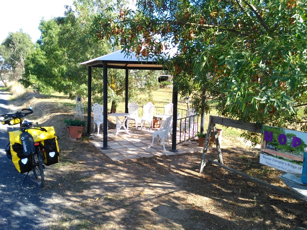 Although today’s ride is short it is hot and an interesting little wind is developing. There were quite a few climbs up through cuttings and very little flat riding for the first several kilometers. The countryside looks tremendous with it’s straw colouring dotted with large gum trees – and even one crop dusting plane.