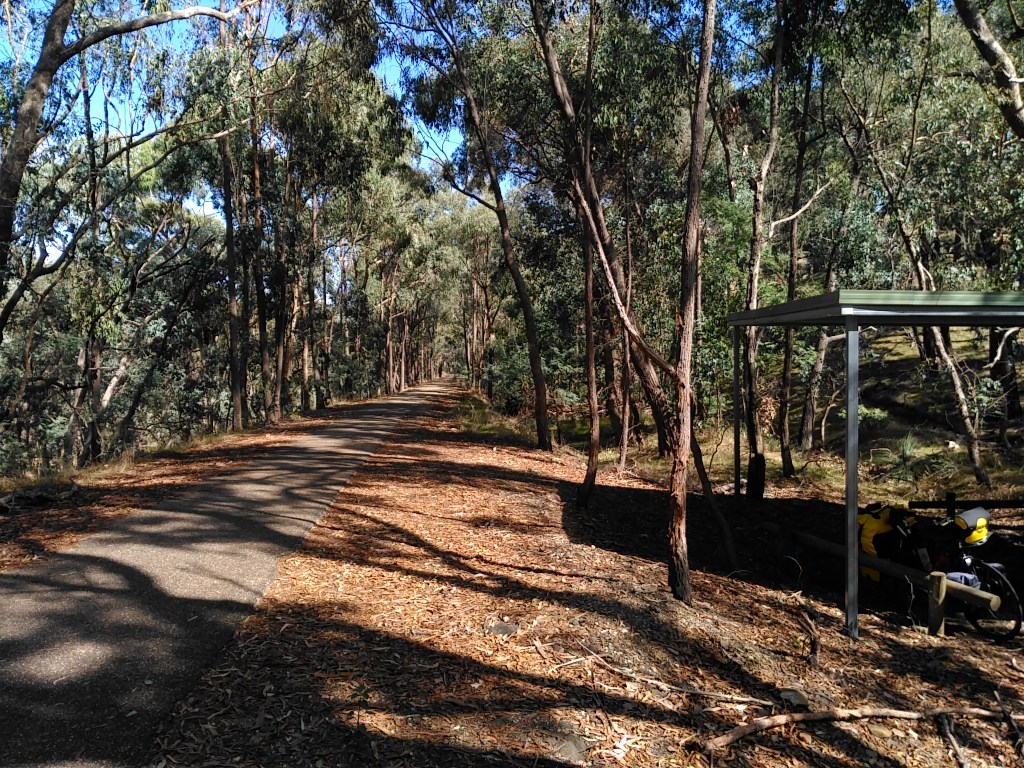 Today’s ride clocked in at 16 ks for the climb to Beechworth but then I pottered about town looking for an ATM and a bottle of red thus bring the total for the day up a bit. But it also climbed over 300 meters so not a piddling day’s ride. It proved to be one of the busiest days on the trails so far with many riders using two vehicles so they could start at Beechworth and ride down only. Four people did ride up, overtaking me easily.