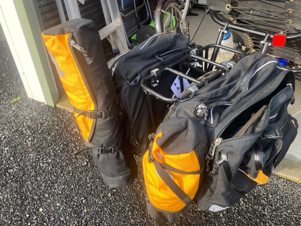 Not good enough yet though. I had sized it so the Veltop fitting would be out of the way of the panniers; except when I attached the tube bags that fit on the rear of each pannier there was a clash. Maybe I will have to send off for the Veltop fitting that bolts onto the seat. One more go and I will decide. Ideally I can make a fitting that holds the Veltop rear bracket and also has posts for lighting and a hole or holes for flag/s to sit in. That’s my aspiration!