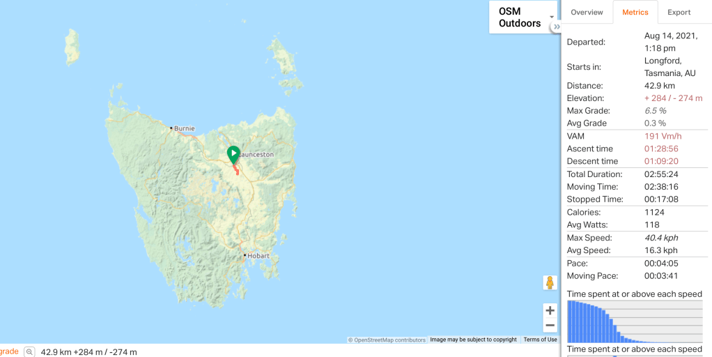 I chose the above map to show where Saturday’s ride was because the colourings really show how the Norfolk Plains are in the flatter part of Tasmania. Once we venture outside the light green it gets pretty hilly.