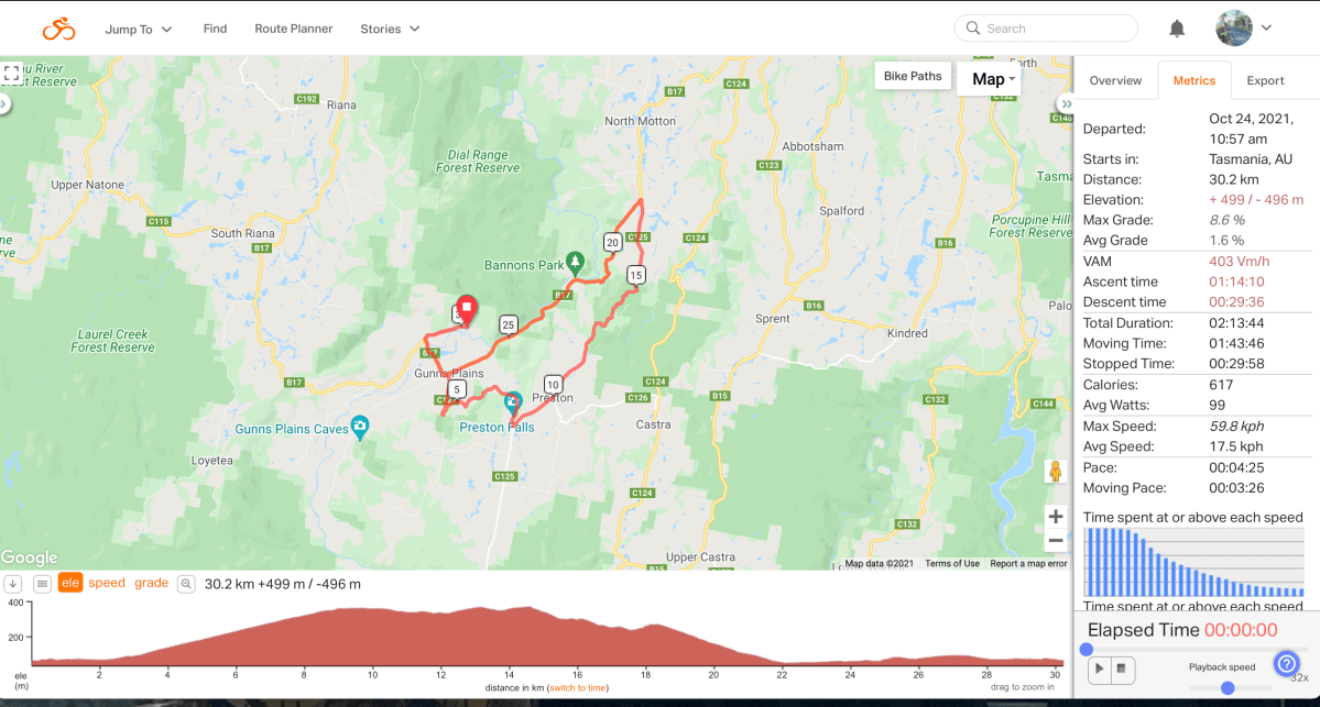 That leg complete, the last stage of this ride is the glorious descent back down to Gunns Plains. This is a twisty ride and I took it a bit carefully as I haven’t yet fully mastered the bike and leaning it over too far it feels a bit like riding a “bendy” bike. The rains had also left gravel and tree debris on the road surface which needed to be avoided. Whatever, it was still a good downhill even though I limited the speed to the early 40s (kph).