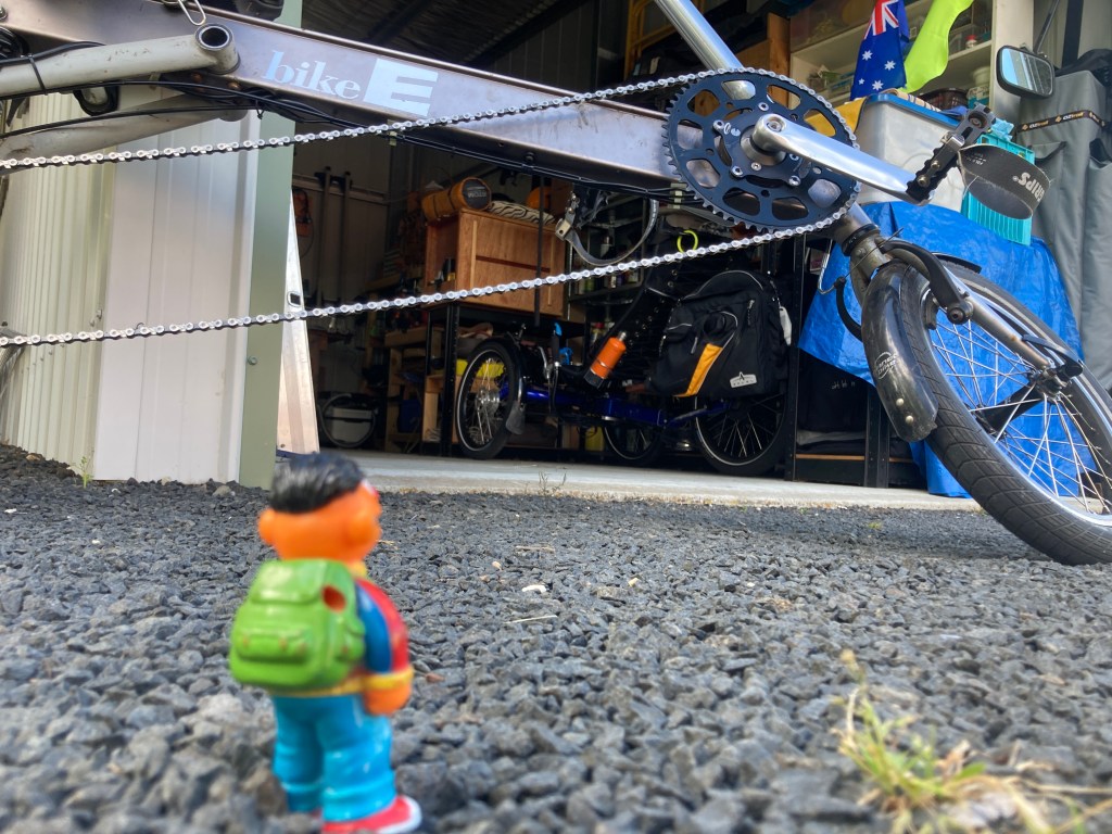 Ernie’s job is that of “Mascot”. He was lured here when he heard I had called Bike E, “Ernie”.