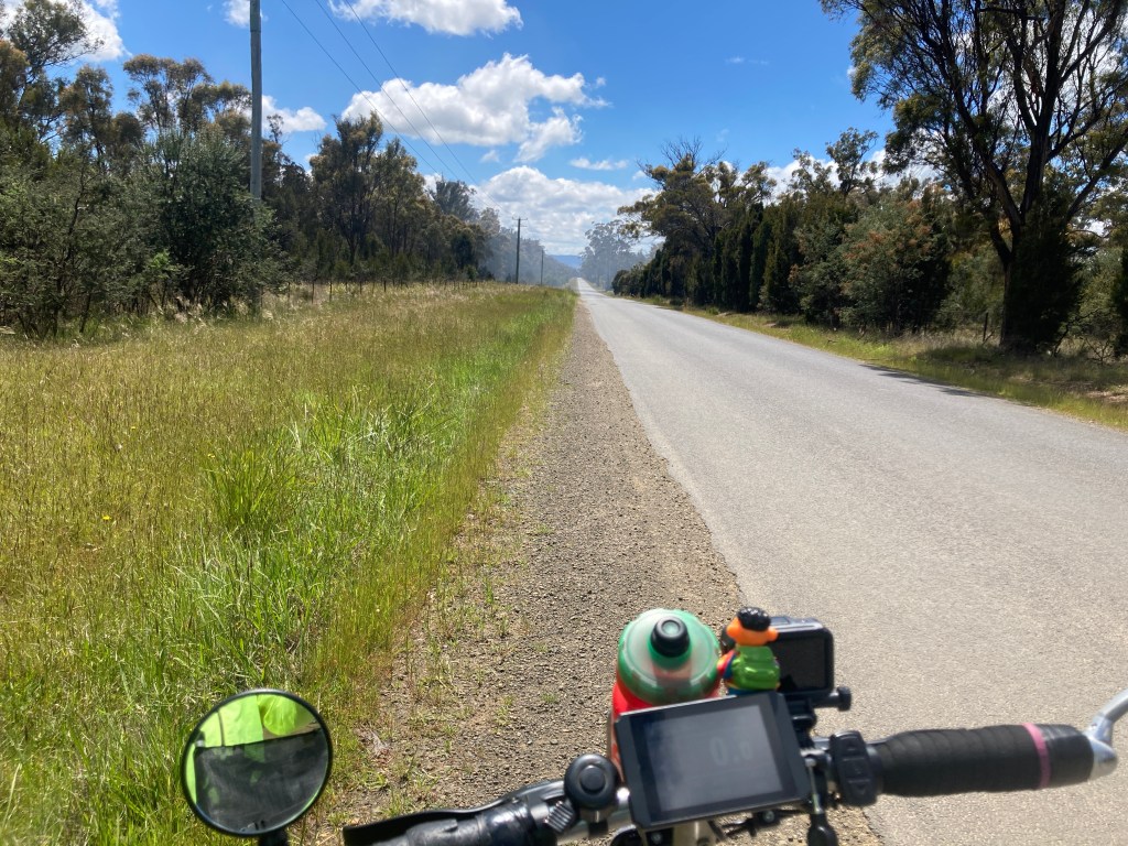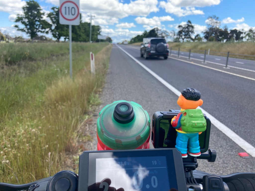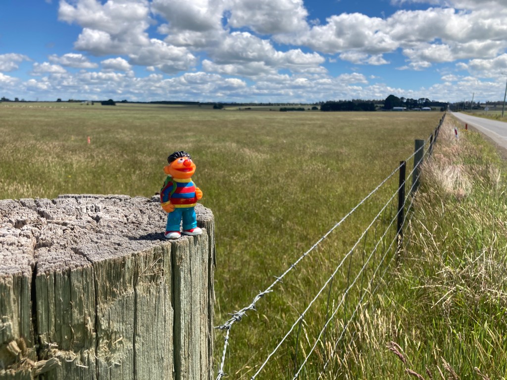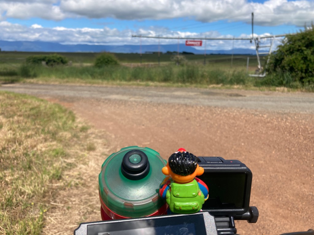 Emily is always careful to take her “guys” along dirt roads wherever possible to avoid scaring them with busy traffic. Sorry Ernie, we have to do this. Ernie hid out in the pannier while we negotiated 8 kilometers of highway up to the Longford turnoff. It wasn’t a bad run. Traffic was light and nearly everyone moved over as much as they could. Only one guy hooted and then gave the finger. A strange thing as we were well over to the left of the hard shoulder and in no way interfered with his progress. Must just hate cyclists or Sesame Street characters or both.