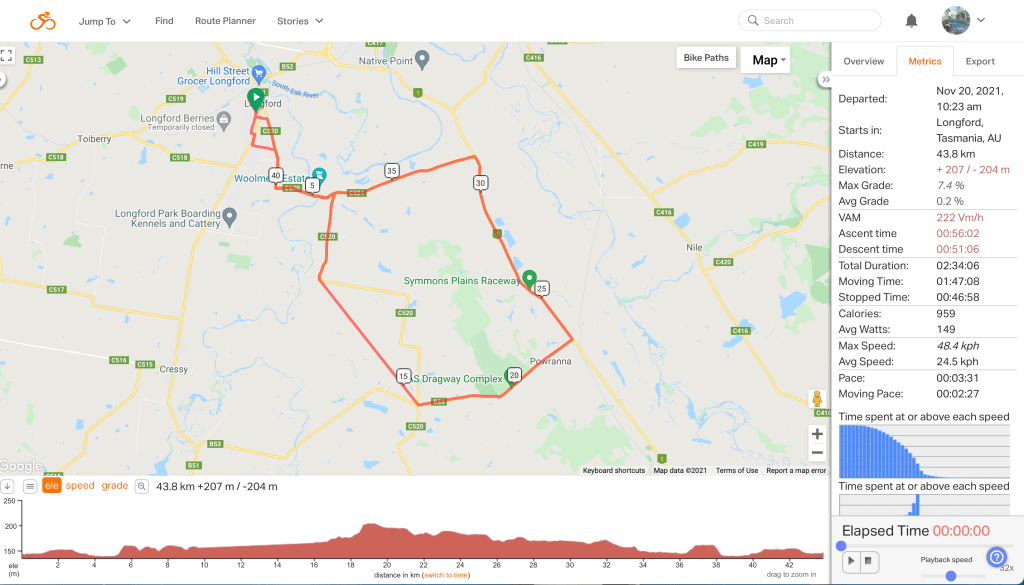 After the Longford turnoff it was the usual rural road potter back to Longford with a surprise 48 kph run down the hill to the Woolmer’s bridge.
