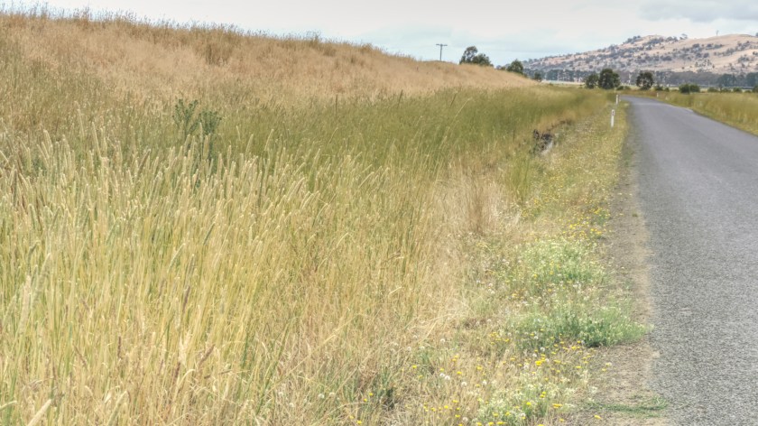 The route is divided into sections by Powranna Road, Barton Road and Macquarie Road. Chintah Road takes us to Powranna Rd, Mt Joy Road takes us to Barton Rd and Valleyfield Road takes us to Macquarie Rd. There’s not a lot of other landmarks and certainly no towns on the way. It’s all dried out fields, lots of fencing, long driveways leading to distant farmhouses and lots of Keep Out signs. There are only a few safe pull-off spots so one tends to take rests at the road junctions.
