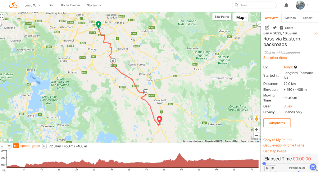 The next bit was quite hilly but we were soon over that and diving down the hill past the poppy processing plant. A bit further on and we had arrived at Powranna Road. At this stop I took on more water and then the last leg along Chintah Road to Woolmers was just more of the same! What a ride. Soon I was back in Longford ready for a shower and a coffee.