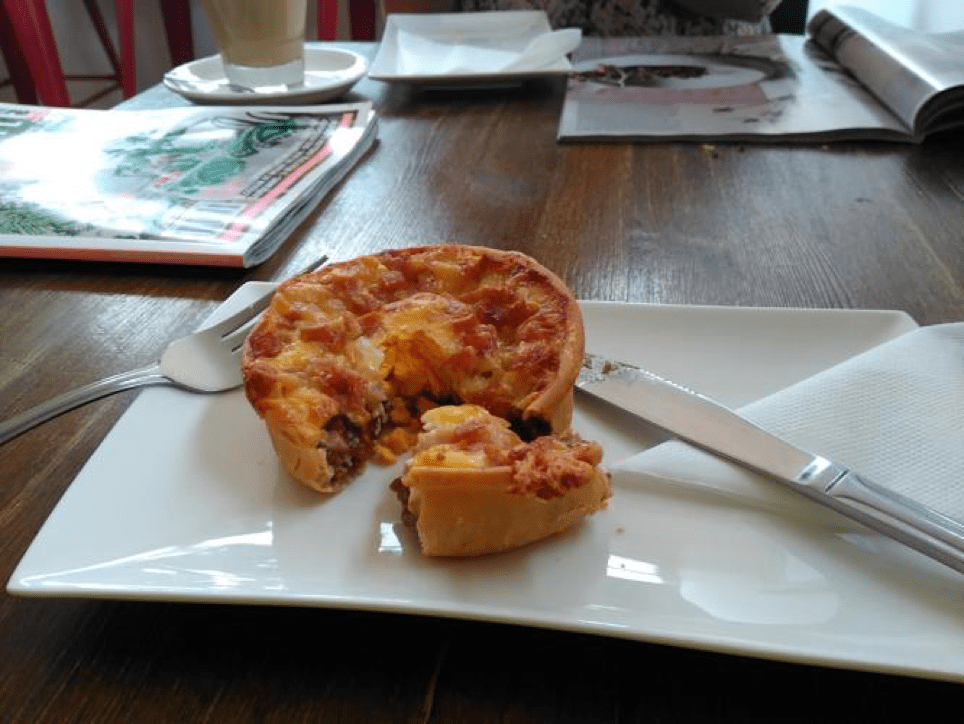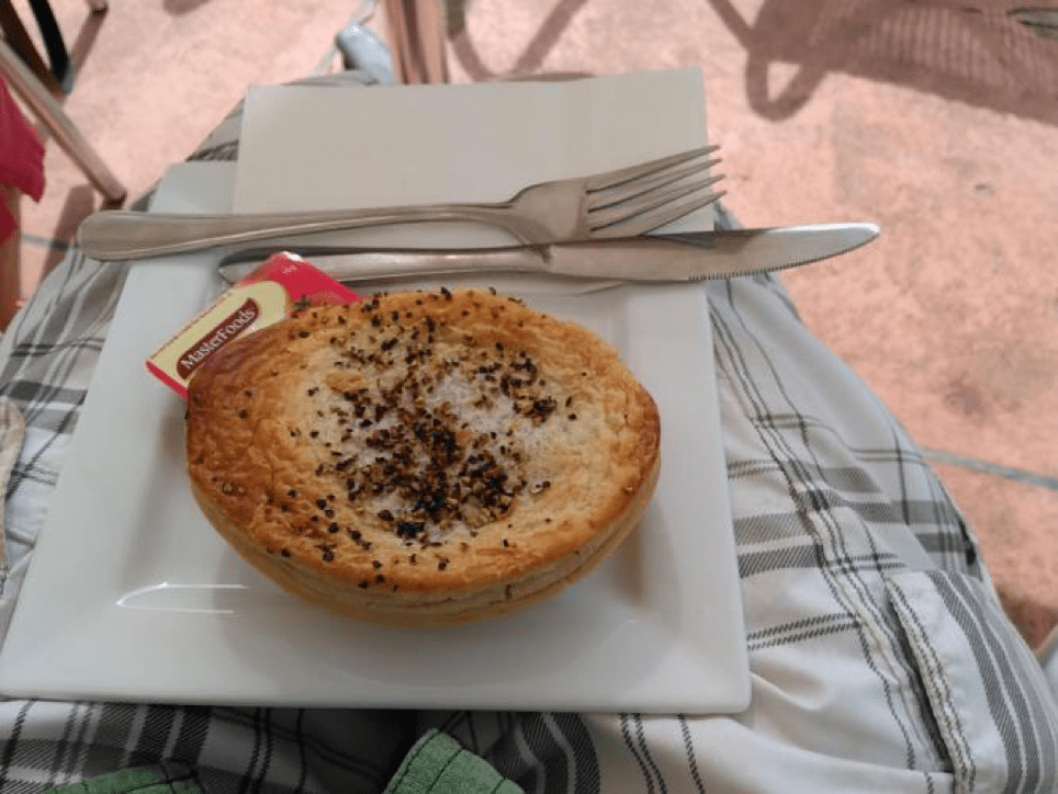 PIEs are served in a number of ways. Sometimes in a paper bag with nothing else; sometimes with a full salad; sometimes with hot chips; sometimes on a plate; sometimes with plastic and sometimes with “proper” eating irons. There will be a whole world of variety to deal with!!