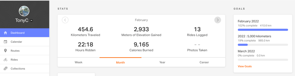 Cycling challenge met for February. I had hoped for a final ride on the 28th but wind and rain said “No”.