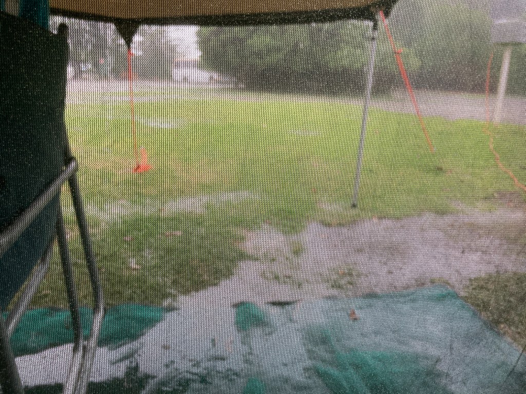 By 3pm it was raining. Raining really hard. Maybe you can see in the picture through the fly screen that the ground all around was topped with flowing water. It was very noisy in the tent but no water entered – except through the slot for the power cord. The flysheet did a good job keeping the worst away from the back and sides while I lowered the front awning enough so I could cook under it while it kept the rain off the front.