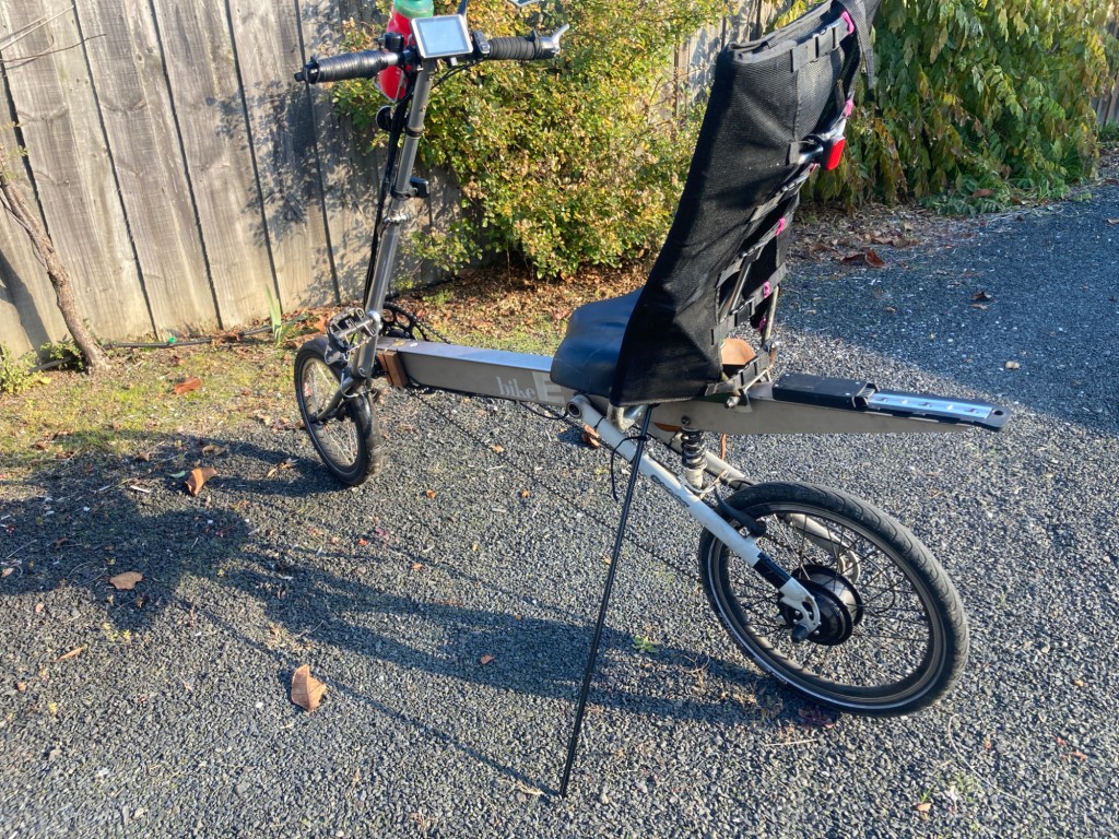 When the rear wheel motor was added there wasn’t enough space for the old stand – so I have been leaning the bike against stuff. After trying a couple of stands and working out fitting one is a bit difficult on a weird bike, I remembered a device called a Click-Stand. I knocked up a prototype using electrical pipe and a wooden crutch and it worked. Using the prototype length as a guide I ordered a Click-Stand (from Canada) and it appeared on my doorstep surprisingly quickly.