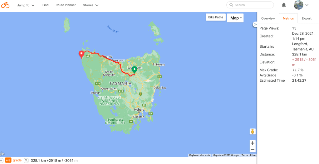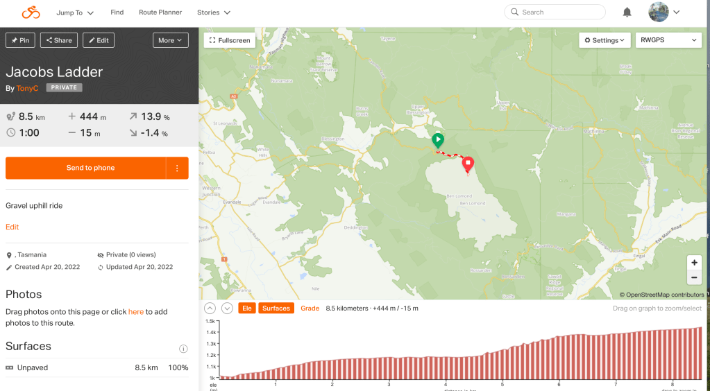 After lunch and brewing a coffee, I saw a steep gravel path leading away from the picnic spot going up towards the Pub. On the way out I decided to explore and I found it did, indeed, lead me out onto the road via the Pub car park. The slope was interestingly steep at 9.8% according to the often shaky gradient figures from Ride with GPS. Nearly 10% on gravel with single rear wheel drive gave some slippage but not too much. Just don’t step on it suddenly as then the tyre will spin. Interesting. Jacobs Ladder, in the Ben Lomond National Park, a gravel climb I have wanted to try for ever, goes up to 13.5% (again according to Ride with GPS). I might be able to climb it. Another project !!