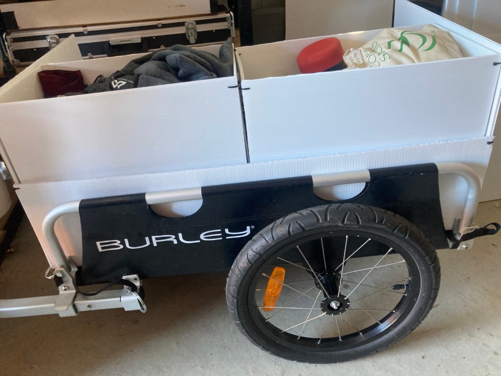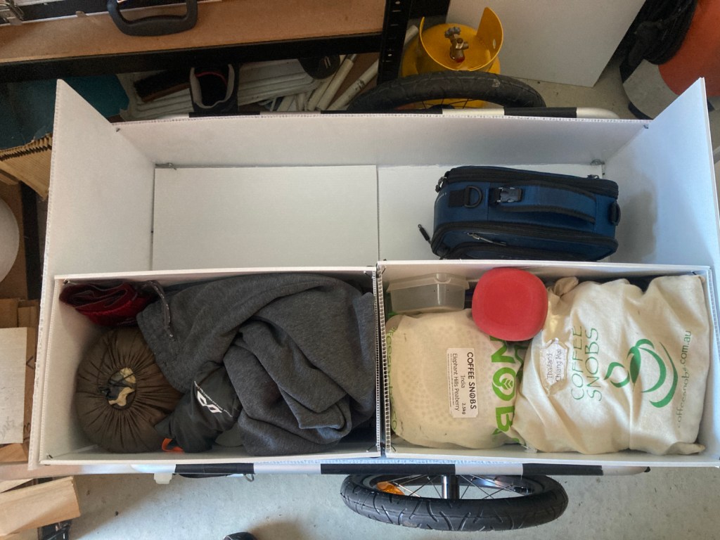 Another use is for making small caravans – particularly in Germany where the DIY of tiny caravans for attaching to e-bikes is going gang-busters. I studied “how to” in a series of videos by Robert Beriault from Canada depicting how he made his very small bicycle caravan and I decided to use some of the techniques to add a box to the trailer’s flat bed. Then add, inside the (hopefully) waterproof box, a series of 4 storage boxes to hold the camping kit. My objective is to compartmentalise the gear making it easy to store, access and keep in order! Then not add too much just because space is available.
