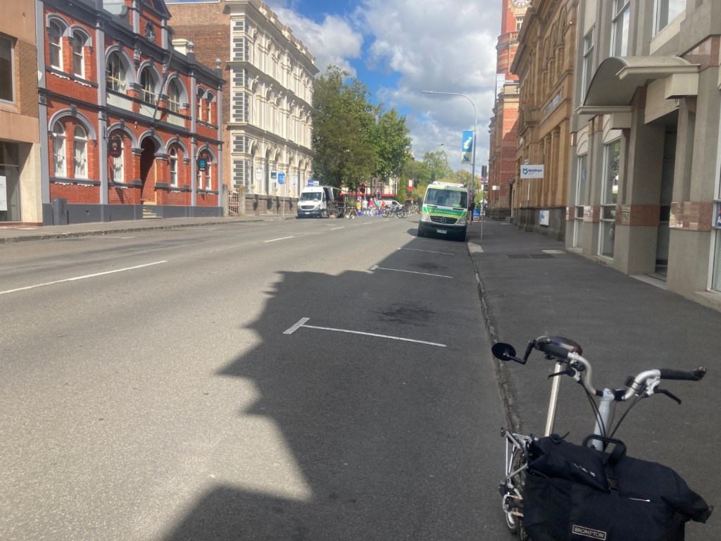 The next block was totally closed off to traffic and available to cyclists in its entirety . Again, I was the only person cycling. A St Johns Ambulance was parked by the kerb – I considered falling off and giving them something to do but quickly thought better of it.