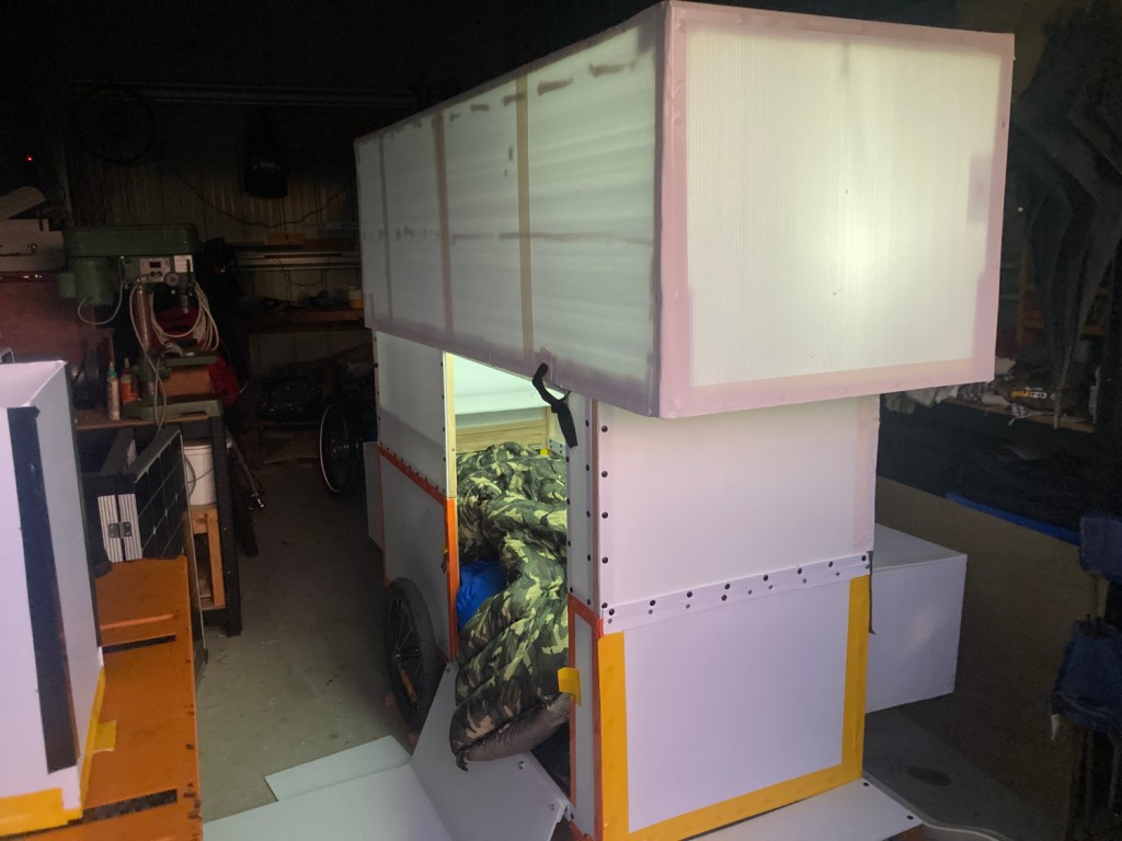 On arrival at Bracknell I was feeling a bit tired and wasn’t too keen on setting the camper up. Colin egged me on to do the right thing – so while the kettle boiled I tackled the job. The trip showed the strap holding the hood and the new anti-bulge brackets were working. During the ride there was no noise from the hood moving about and, on setup, no coreflute damage was visible. The noises in the latter part of the video were from the battery mount. Something to be fixed.