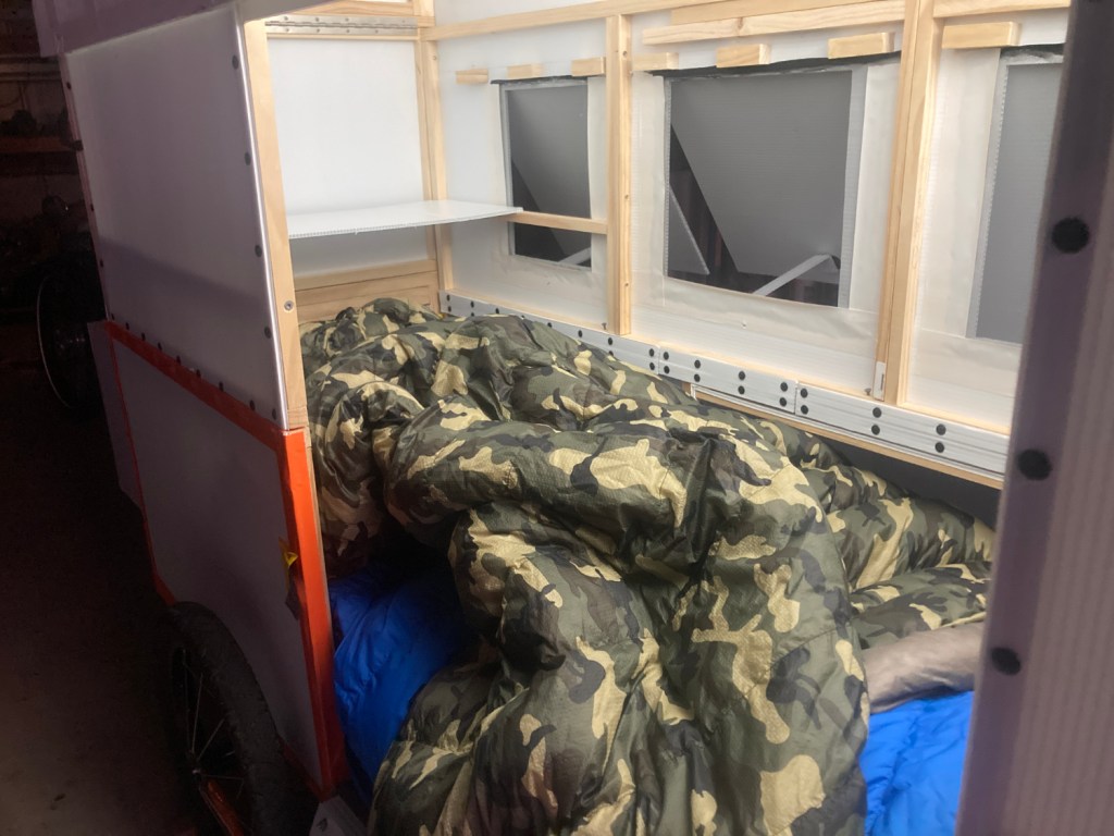 First though – what’s it like to actually sleep in the trailer overnight? I got to thinking “how hard is it to get in the sleeping bag while in the narrow space of the trailer” and “will changing clothes be doable?”