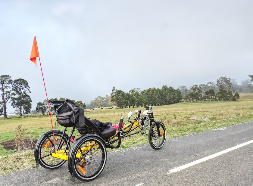 Just before arriving at the cafe the electrics on my trike had played up a bit. I thought I had a puncture but no, the power was on to the display, the display showed I was on level 3 but no power was getting to the motor. The driveway from Georgies out to the road is pretty steep and quite gravelly so I hoped turning the electrics off and on again had fixed the problem. It was with some relief the power started to flow as per normal. I used low settings and cycled up the drive without problem. Colin’s system seems to feed the power in more intrusively than mine and he found his trike slipping and sliding on the way up. We remembered his difficulties getting the trike and trailer up a gravel hill when we left the Liffey Falls campsite last year – but this time he made it to the road without pushing.