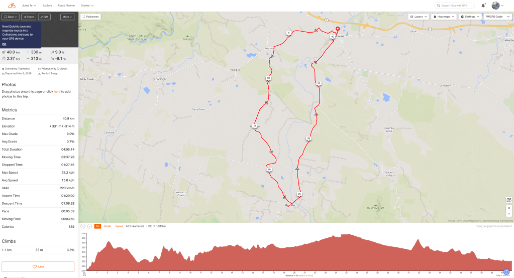 We chooffed slowly up the back streets, joined the main road, rounded the roundabout at the top and started the descent towards Mole Creek. The sense of anticipation built – soon we would be on Montana Road amid the peace and quiet of rural Tasmania heading for a coffee at 41 Degrees South, Georgie’s Cafe. But before then Mole Creek Road was proving a bit busy so – be careful.