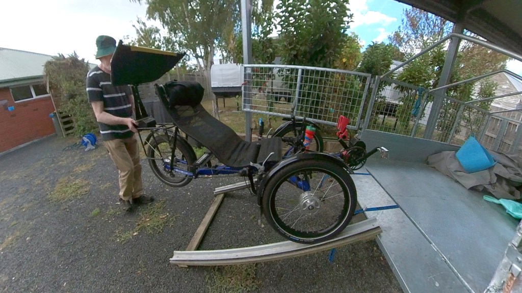 On the ride to Meander (last blog entry) Colin and I discussed the need for ramps to assist with getting the trikes in and out of the trailer. One day Colin brought round some strips used with an aluminium roof he thought would work. We tested using trike and trailer and it looked promising.