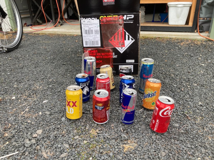 On one of my first rides with the E-City I rode this short stretch of gravel. I noticed a can, then another and quickly filled one pannier. You are not allowed to crush the cans as the machine has to read the barcode, so I can’t fit in as many cans as there are cans by the roadside.